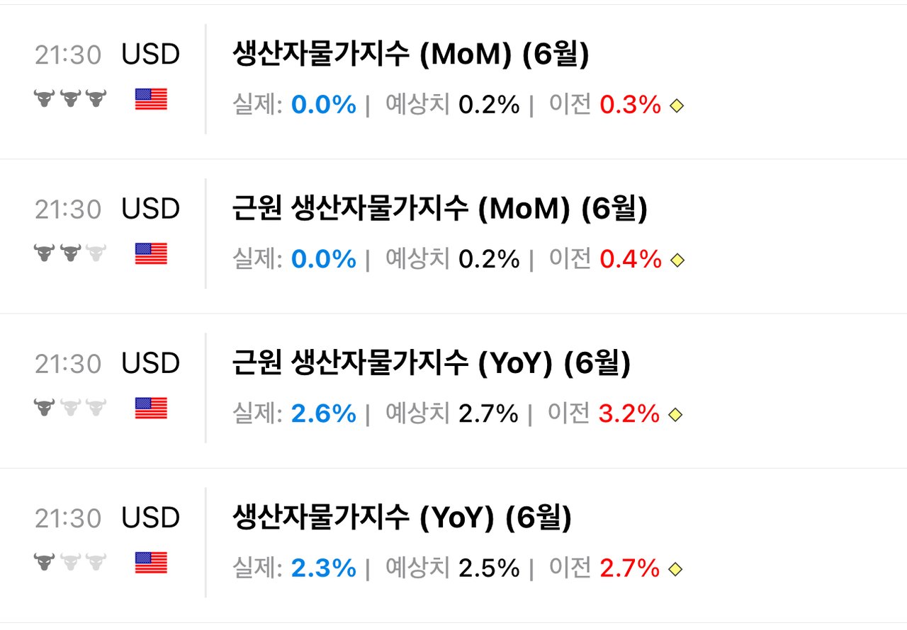 과연 관세로 인한 인플레이션은 존재하는 걸까? 중요한 인플레이션 지표인 CPI는 기업이 소비자에게 가격 인상분을 전가하지 않으면 사실 별 영향이 없는 게 합리적일 것 같다. 그렇다면 소비자 지표가 아닌 기업 지표인 PPI는 어떨까? 마침 CPI에 이어 미국의 6월 PPI도 발표되었으니 간단히 살펴봐야겠다.