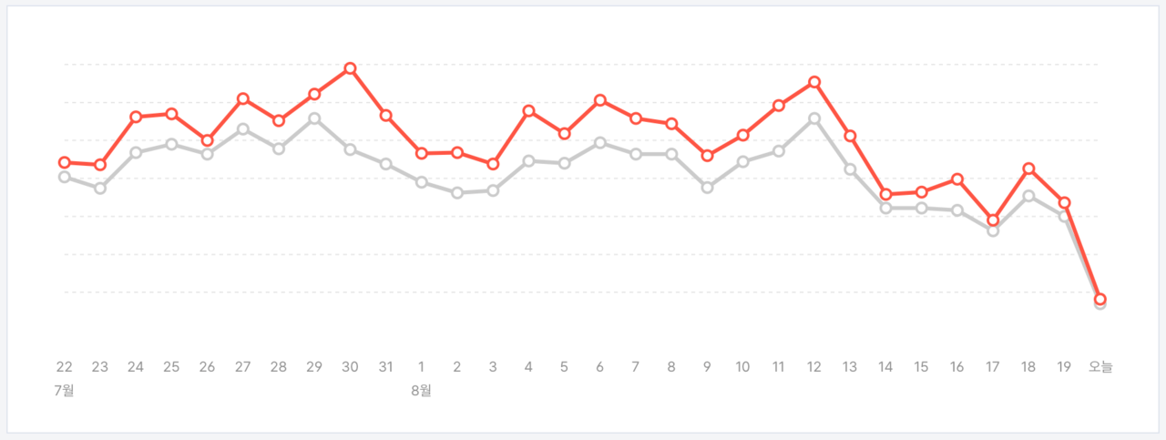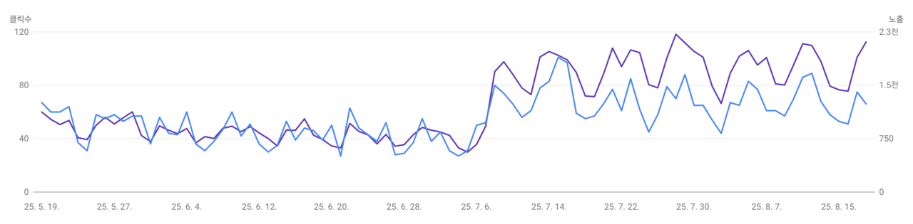 구글에서는 이런 현상이 전혀 없었기 때문이다. 노출량 및 클릭양 모두 8월 12일 이후로도 딱히 감소하고 있다는 추세는 아니라고 보인다.