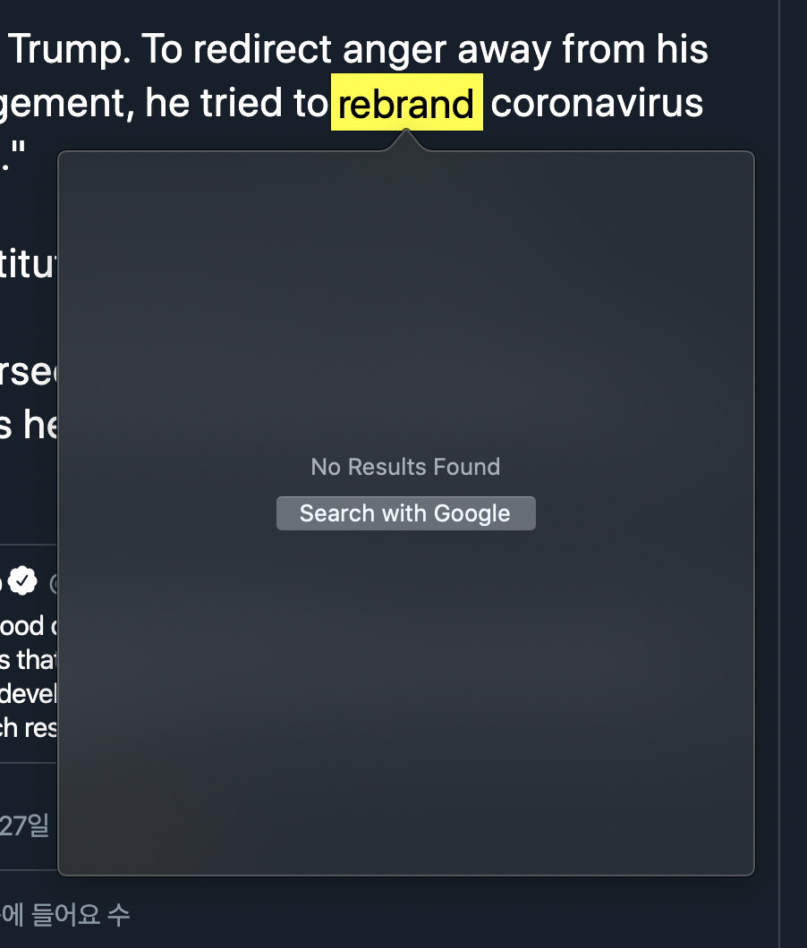 왜냐하면 사전에서 찾을 수 없기 때문입니다. macOS의 영한사전에 대한 단어의 의미가 등록되어 있지 않아서 찾을 수가 없는 것입니다. 허탈하게도 말이죠.