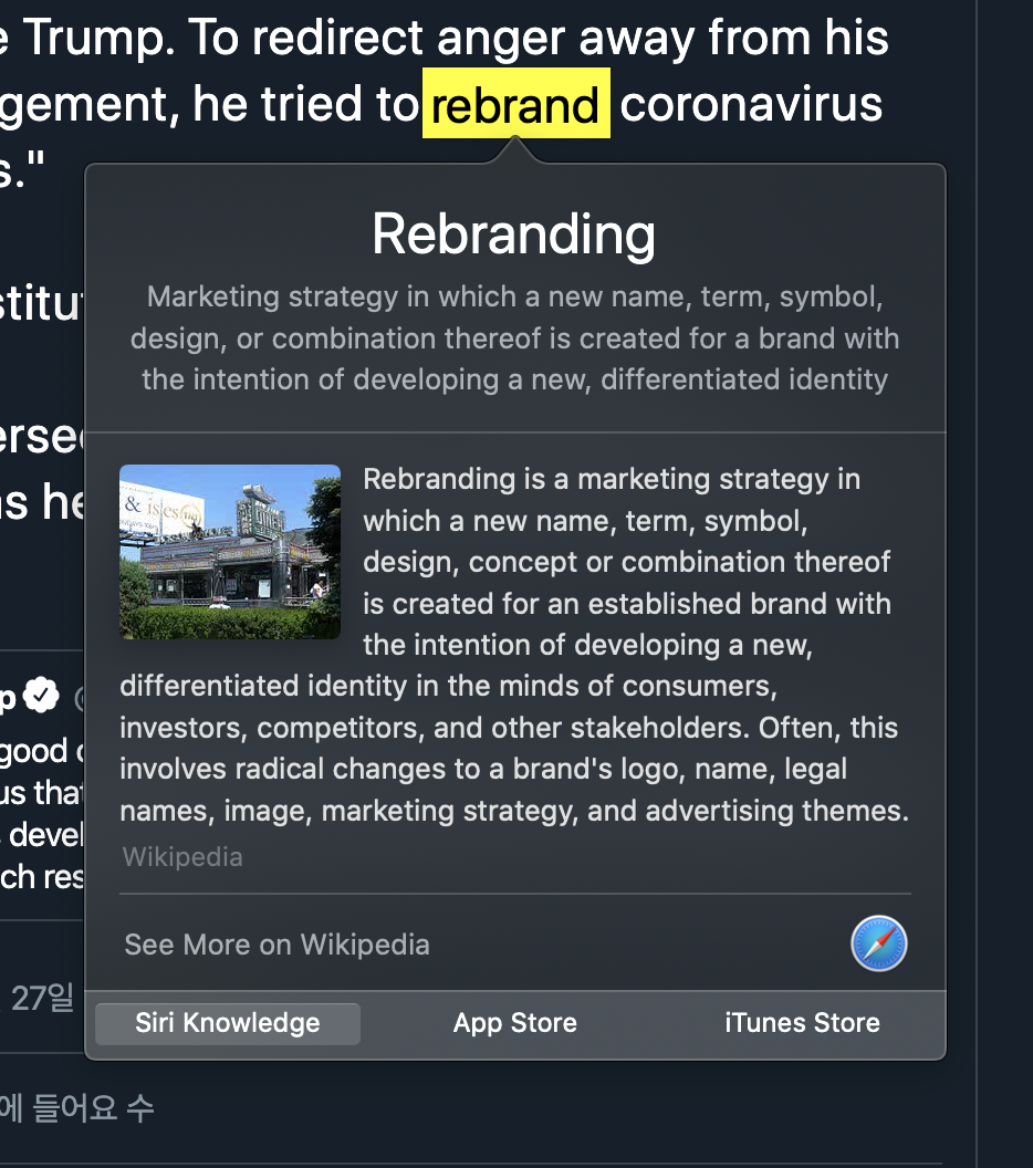 영어 문서를 읽을 때 모르는 단어의 의미를 찾기 위해 macOS에서 트랙패드 세 손가락 터치를 이용해 사전 보기를 종종 사용합니다. 참고로 이 기능은 포스터치 트랙패드가 달려있는 최신 맥북의 경우 기본적으로 한 손가락 깊은 터치로 설정되어 있는데, 트랙패드 설정으로 세 손가락 터치로 바꿀 수 있습니다.