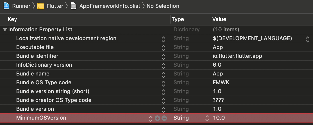 이제 나머지 App.framework의 최소 버전은 Flutter 폴더 아래에 있는 AppframeworkInfo.plist 파일을 열면 편집할 수 있습니다. 여기서 MinimumOSVersion 항목을 찾아서 같은 버전을 입력해 줍시다.