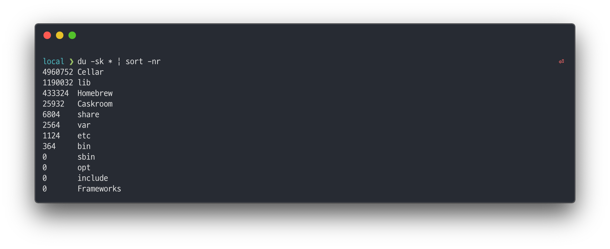 위 커맨드는 현재 디렉터리 안의 모든 파일과 디렉터리의 사이즈를 내림차순으로 정렬해서 표시해줍니다. sort 커맨드의 -nr 옵션은 수치 비교(-n, numberic)로 역순(-r, reversed) 정렬하라는 의미입니다.