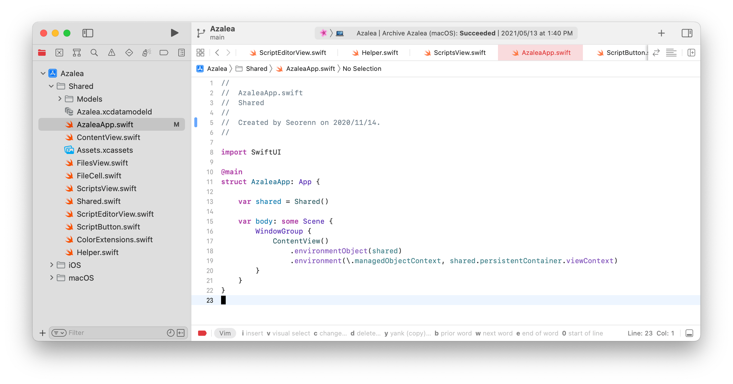 어쨌든 이번 행사에서 Xcode 13도 발표되었는데 이 발표에서 직접 언급되지 않았지만 여러 사람들을 통해 알려진 신기능이 있다. 바로 Vim 모드다.