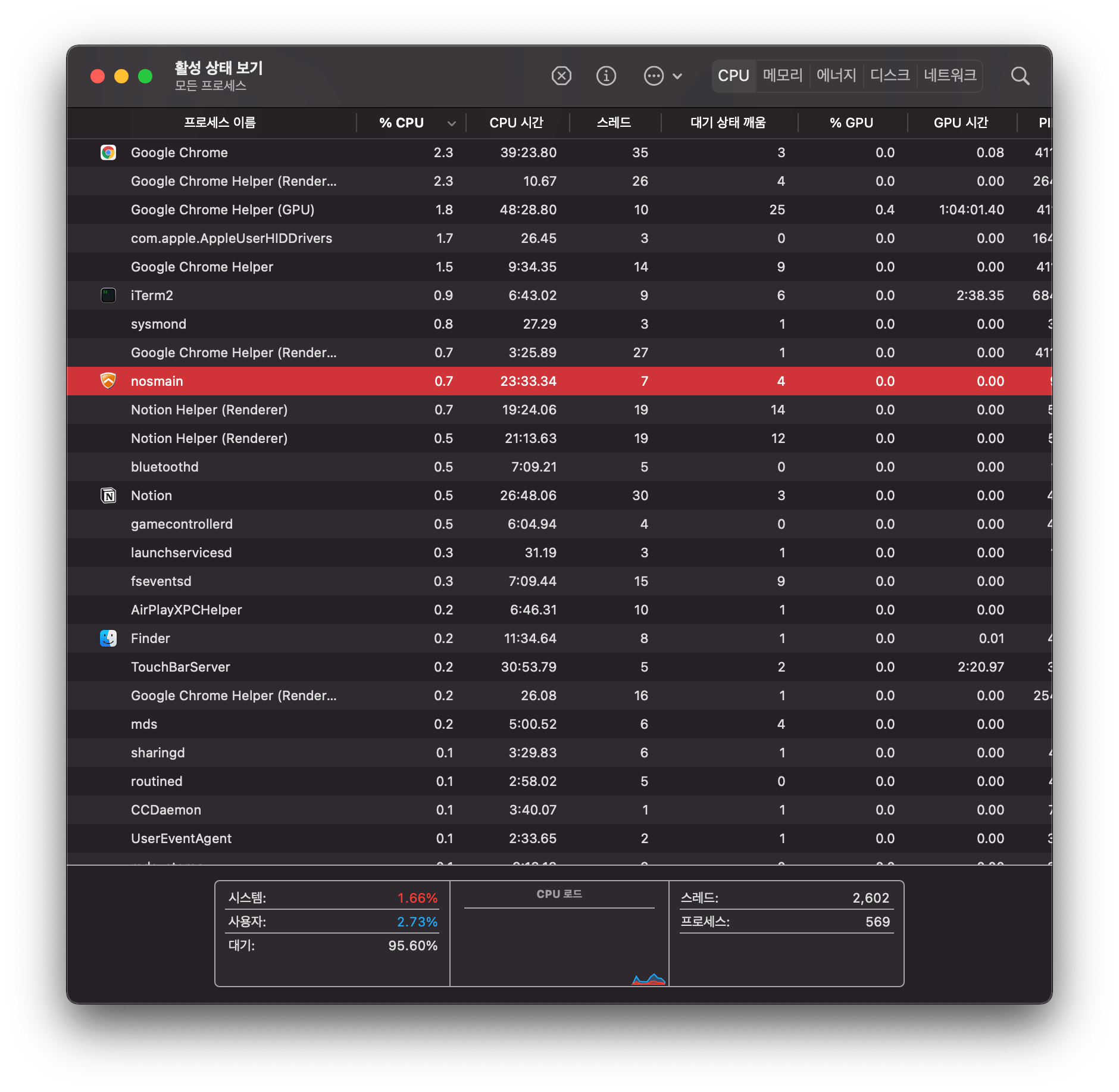약 2주 간 원인을 찾다가 자포자기하고 있던 즈음이다. 활성 상태 보기를 이용해 프로세스 목록을 보던 중 이상한 것이 보였다. nosmain 뭐라는 이름이었다.