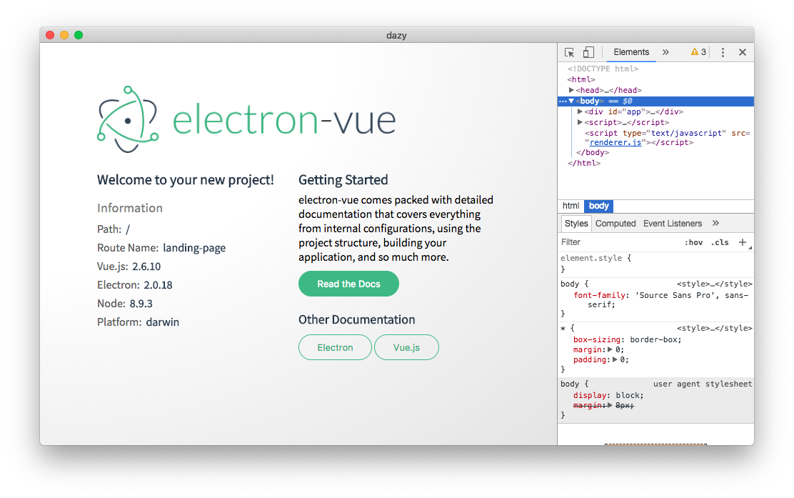 Javascript랑 ES6 공부 겸 일렉트론(elecron)으로 앱을 한번 만들어보고자 했습니다. 거기다 기왕 하는 김에 회사에서 사용하는 vue도 같이 사용해보면 좋을 것 같았습니다. 그래서 찾아보니 electron-vue라는 프로젝트 보일러 플레이트 생성해 주는 프로젝트를 발견했습니다. 목적에 맞는 게 있으니 당장 써보면 좋겠지요.