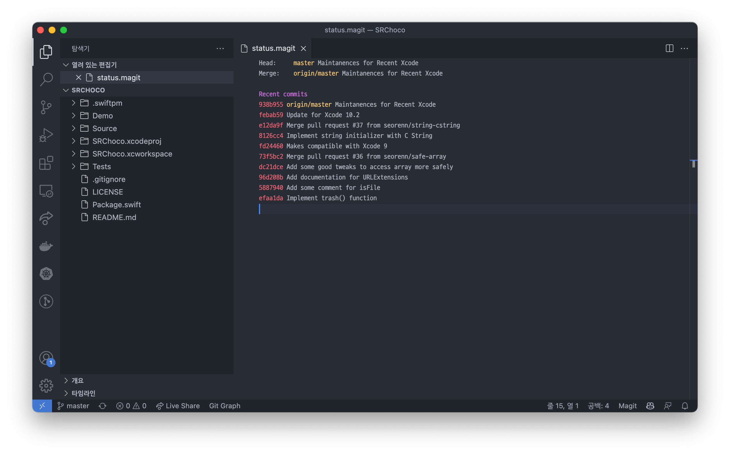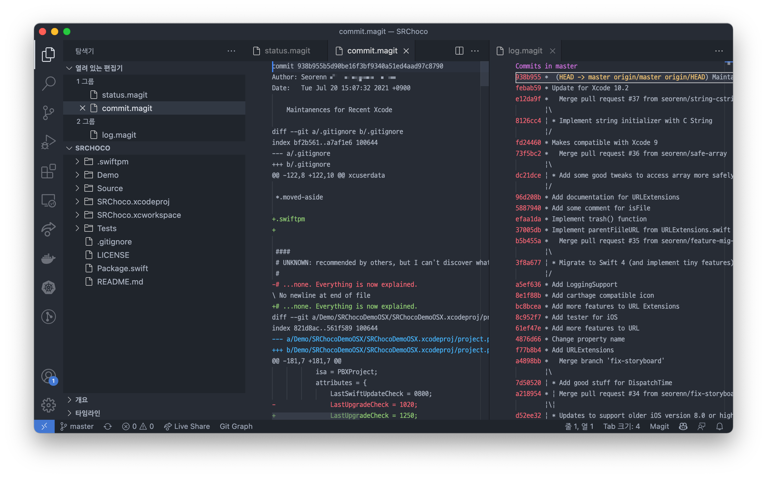 일부에서 조금 다른 인터페이스가 뜨기는 하지만 Magit의 기능을 vscode와 잘 융합해서 녹여낸 느낌이라 불편하거나 이상한 느낌은 없었다. 다만 위 화면에서 탈출하는 과정에서 순서가 꼬여서 키보드로 탈출을 할 수 없던 버그가 있기는 했지만 마우스로 손쉽게 해결이 가능해서 굳이 문제 삼을 필요도 없을 것 같다.
