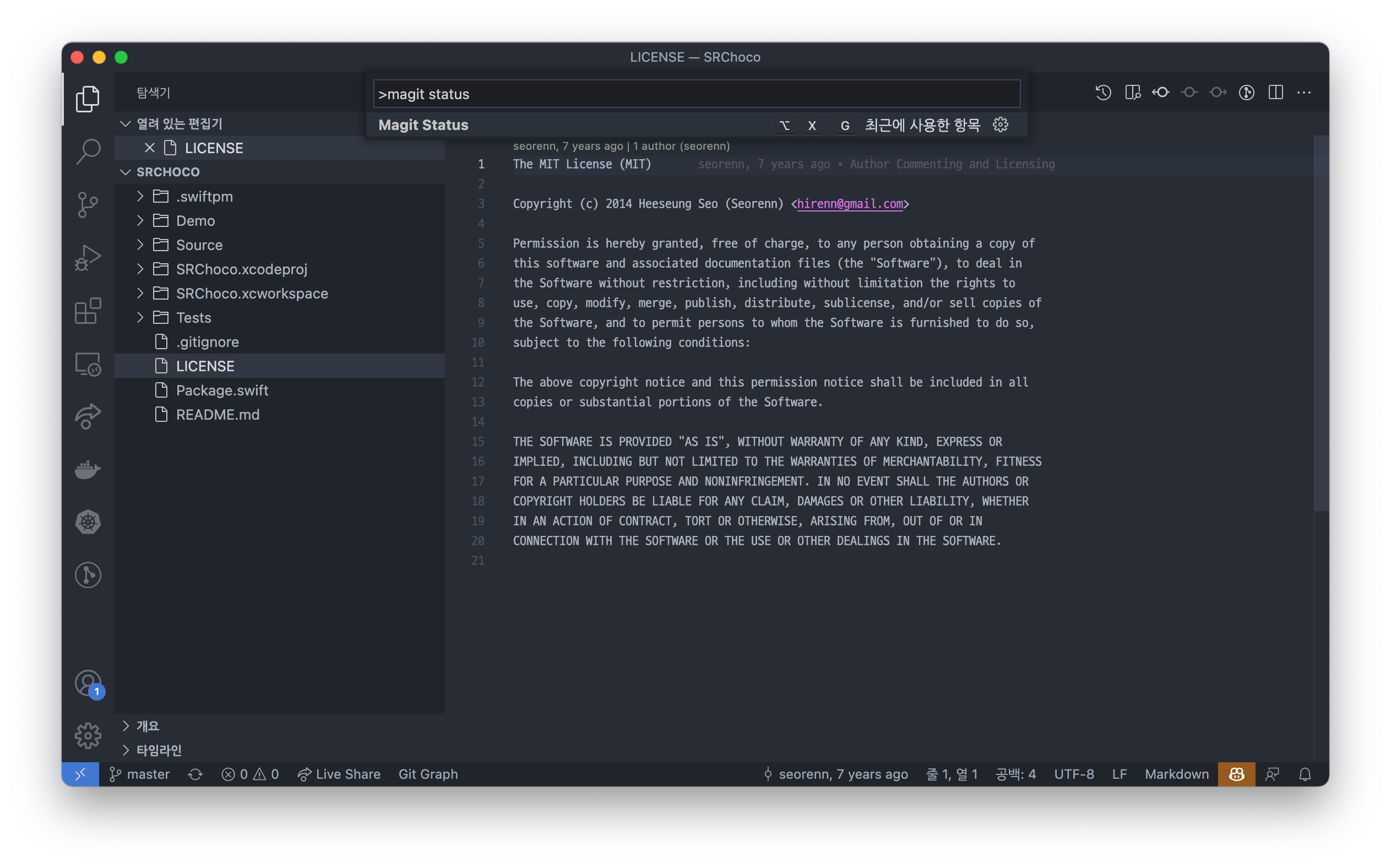사용법도 간단했다. 그저 커맨드 팔레트에서 Magit Status를 찾아보면 된다. 참고로 Magit Status를 뛰우는 단축키도 지원된다고 하지만 매뉴얼에는 alt 키를 기준으로 써놔서 맥 환경에서는 정확히 어떤지는 아직 모르겠다.