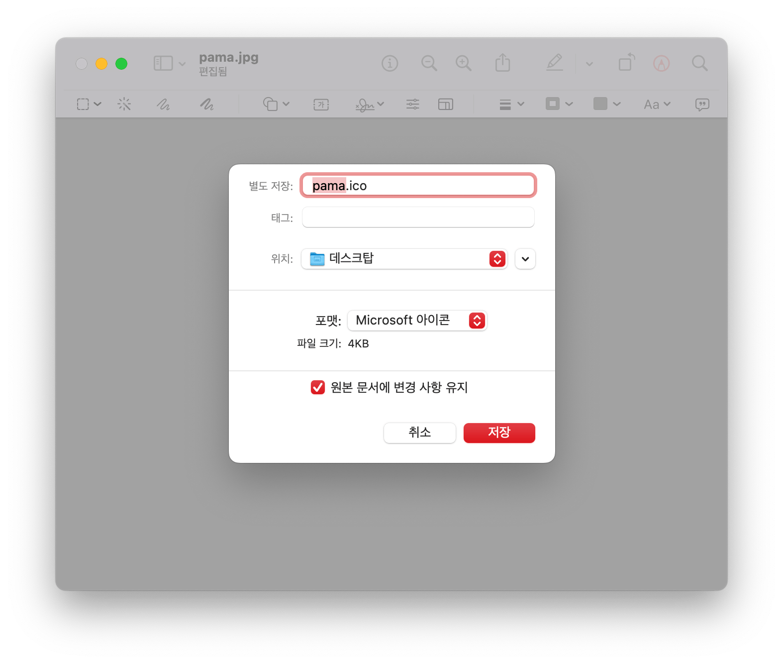 저장 다이얼로그가 뜨면 또 옵션 키를 누른 채로 '포맷'을 눌러보자. 저장할 수 있는 여러 파일 포맷 목록이 나타난다. 여기서 'Microsoft 아이콘'을 선택하고 저장하자.