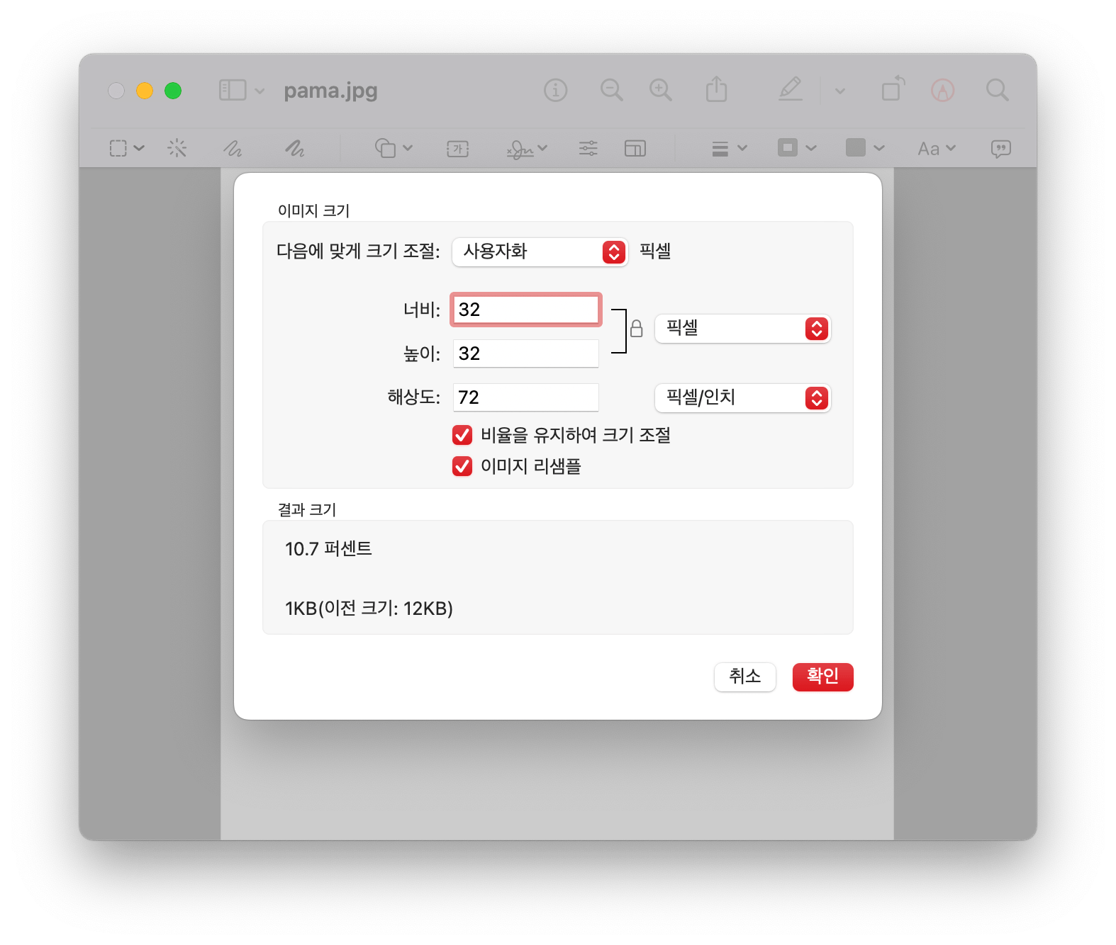 준비된 이미지를 원하는 해상도로 변경한다. 개인적으론 32x32로 했다. 물론 미리보기 앱에서 다 할 수 있다. 도구 - 크기조절 메뉴를 선택하면 된다.