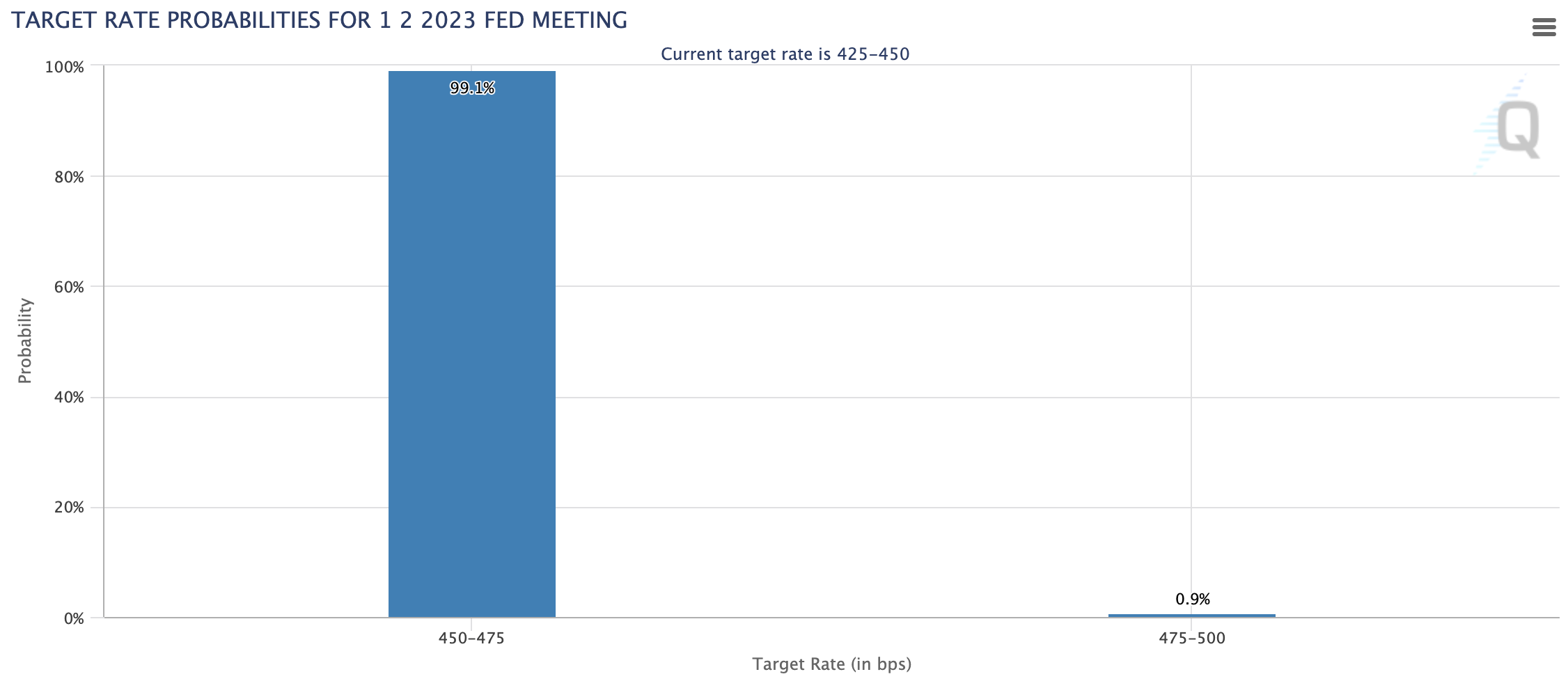 어제 GDP 및 실업수당 관련 지표 발표로 미국 경기가 여전히 나쁘지 않다는 결과가 나왔는데 그럼에도 FedWatch에서는 2월 FOMC에서 25bp 인상으로 의견이 거의 모아졌다. 오늘 PCE 발표가 된 이후 미세한 변화가 있긴 했지만 그럼에도 25bp 인상이 압도적이다. 정말 이제는 침체를 피할 수 있다면 그게 무엇이든 가장 최선의 결과일지도 모르겠다.