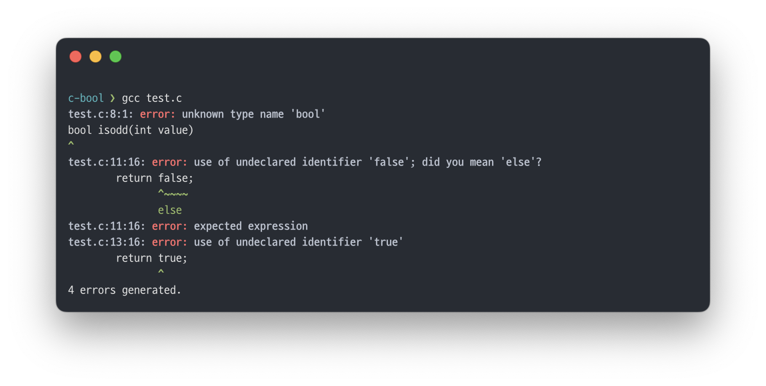거기다 독특한 문제도 하나 더 있다. 안타깝게도 stdbool.h 헤더에 정의된 bool 심볼은 매크로로 정의된 이름일 뿐이지 원시 타입이 아니다. 이 말은 stdbool.h 헤더를 포함시키지 않으면 아래의 코드는 제대로 동작하지 않는다는 말이 된다.