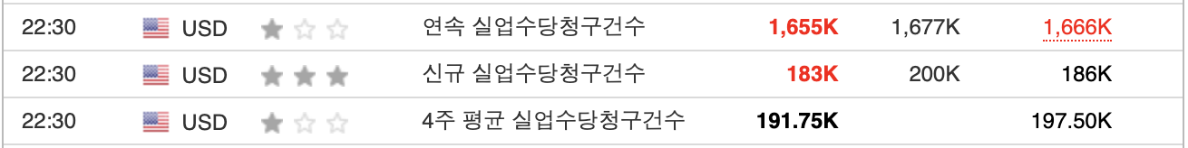 미국의 신규 실업수당청구건수는 줄었고 연속 청구건수도 소폭 줄었다. 둘 다 예상치를 하회했다는 점에서 아직 미국 고용에는 문제가 없다는 참으로 부럽고도 한숨 나오는 결과다.