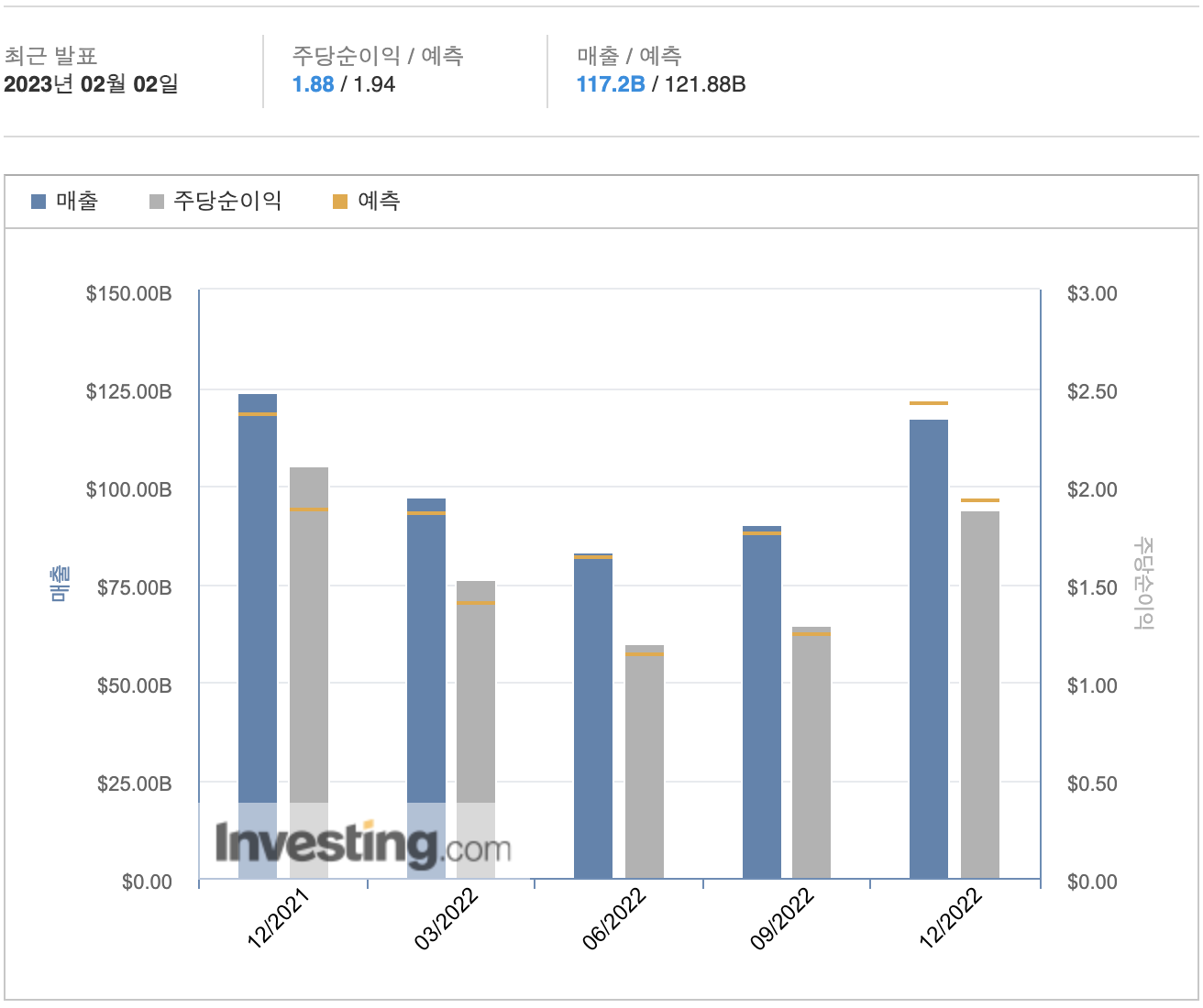 예상대로 이번 애플의 실적은 좀 부진한 편이다. 다만 예측치를 하향했다는 점은 좀 걸린다. 지난 분기 대비 매출이 떨어졌는데 이건 매우 이례적인 일이지만 역시 예상되긴 했었다. 대부분 실적은 나쁘진 않았지만 문제는 역시나 iPhone 판매였다. iPhone 실적은 하필이면 애플 실적의 많은 부분을 차지하고 있는 터라 좀 충격이 클 수밖에 없었다. 뭐 하여간 중국 리오프닝도 진행 중이고 다음 분기 실적은 기대해 볼 수 있지 않을까?