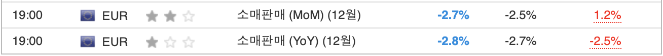 유럽의 소매판매 지수가 전월비 -2.7%, 전년비 -2.8%로 예상치보다 낮게 나왔다. 심지어 전월비로 역성장으로 전환된 모습은 "유럽에는 경기침체가 이미 온 거 아니야?" 하는 생각을 해보게 되는 것 같다.