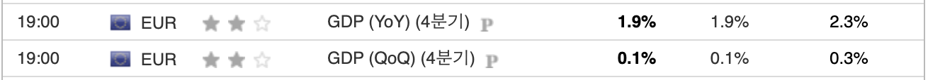 유로존 4분기 GDP는 전 분기 대비 0.1% 올랐고 전년 4분기 대비 1.9% 올랐다. 성장률이 줄어들긴 했지만 다행히도 역성장은 피했다.