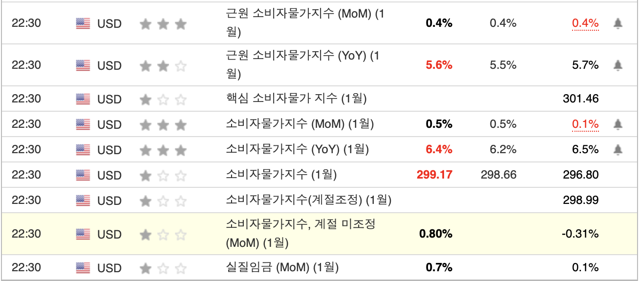 미국 1월 CPI는 예상보다 좀 뜨거웠다. 일단 예상치를 약간 상회한 수치들이 보인다. 그나마 다행이라면 지난달 혹은 전년 보다 상승률이 더 오르지는 않았다는 점을 들 수는 있겠지만 불행히도 실질임금이 지난달보다 더 올랐다는 불행한 소식이 쌤쌤을 만들어 버릴 것 같다. 최악은 피했지만 인플레이션의 하락 속도가 기대만큼은 안 나오는 것이라서 자산시장을 그다지 좋은 분위기로 만들 소재는 아닐 것 같다.