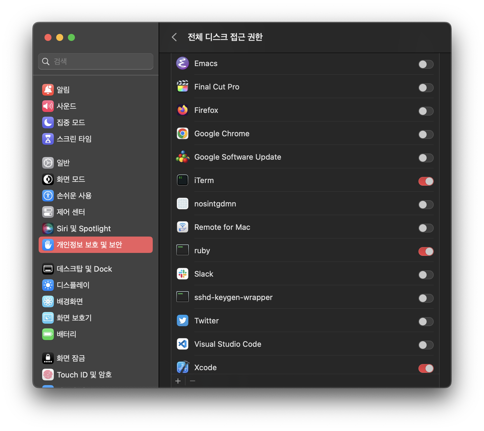 이를 해결하기 위해선 터미널에 전체 디스크 접근 권한을 부여해야 한다. 이 설정은 macOS의 '시스템 설정 앱 - 개인정보 보호 및 보안 - 전체 디스크 접근 권한 항목'에서 찾을 수 있다. 여기서 필요한 터미널 앱의 스위치를 활성화 후 터미널 앱을 재시작해주자.