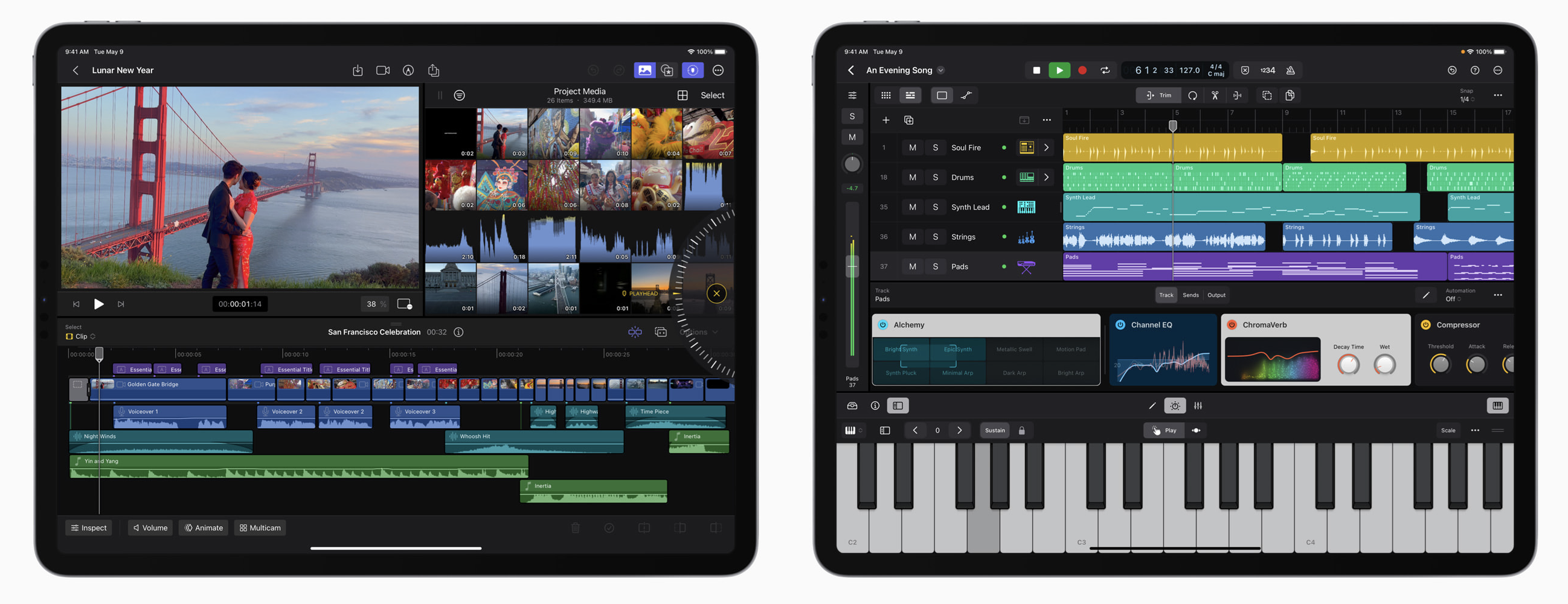 - 애플이 iPad용 Final Cut Pro 및 Logic Pro를 선보였다. 이제 iPad에서도 영상 및 음악 관련 전문적인 작업이 가능해졌다. 다만 영상은 모르겠는데 음악 쪽은 플러그인 확장과 외부 전문 장비 연결성이 상당히 중요하기 때문에 얼마나 위력적 일지는 잘은 모르겠다.