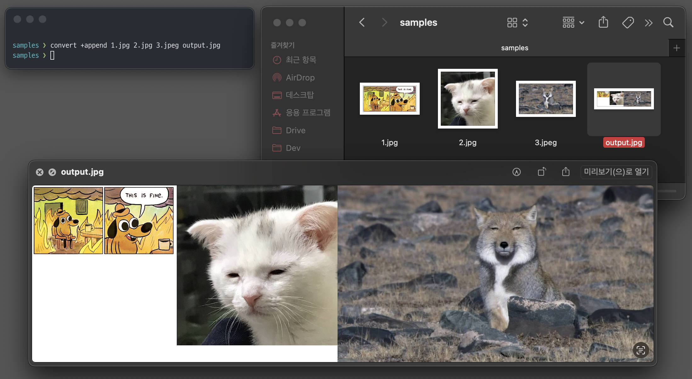 위 커맨드는 역시 1.png, 2.png, 3.png 세 개의 이미지를 가로 방향으로 연결해 output.png 라는 파일에 합쳐준다.