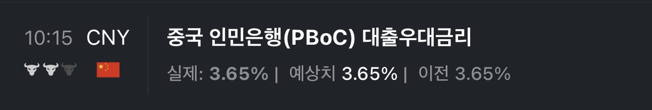 - 중국은 1년물 LPR 금리를 3.65%로 동결했다. 사실상 기준금리로 불리는 대출금리인데 최근의 디플레이션 조짐에 대해 당장은 완화를 할 생각은 없는 모양이다.