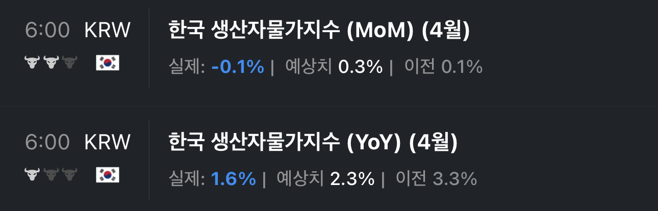 - 한국의 4월 PPI도 발표되었는데 제법 둔화되었다. 심지어 전월 대비로는 오히려 떨어졌다. PPI는 CPI의 선행지수이기도 하기에 정말 2%대 CPI를 구경할 가능성이 있어 보인다.