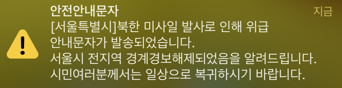 그래도 빡칠 수밖에 없었다. 왜냐하면 경보가 해제되었다는 알림이었기 때문이다. 분명 오발령이라면 경보는 없었던 것이 맞는 게 아닌가? 왜 또 해제한다는 걸까? 근데 미사일? 우주발사체라며? 뭐 그게 그거긴 하다만.