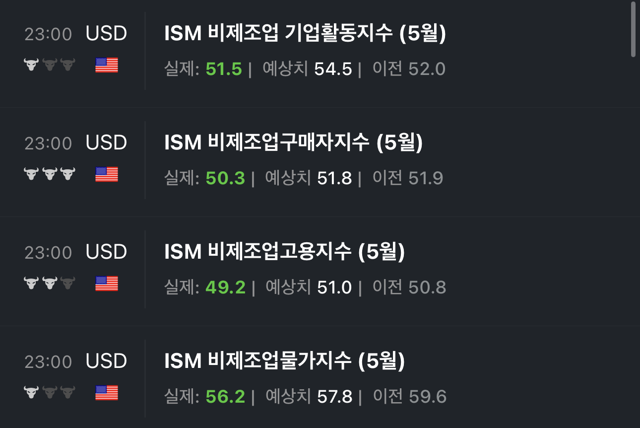 - 위와는 다르게 ISM의 설문조사로 나온 5월 비제조업PMI는 둔화된 모습이 나타났다는 점에서 고무적인 것 같다. 그 외에 모든 면에서 나쁘진 않은 지표가 나왔다고 생각되는데 시장은 어떻게 반응할까?