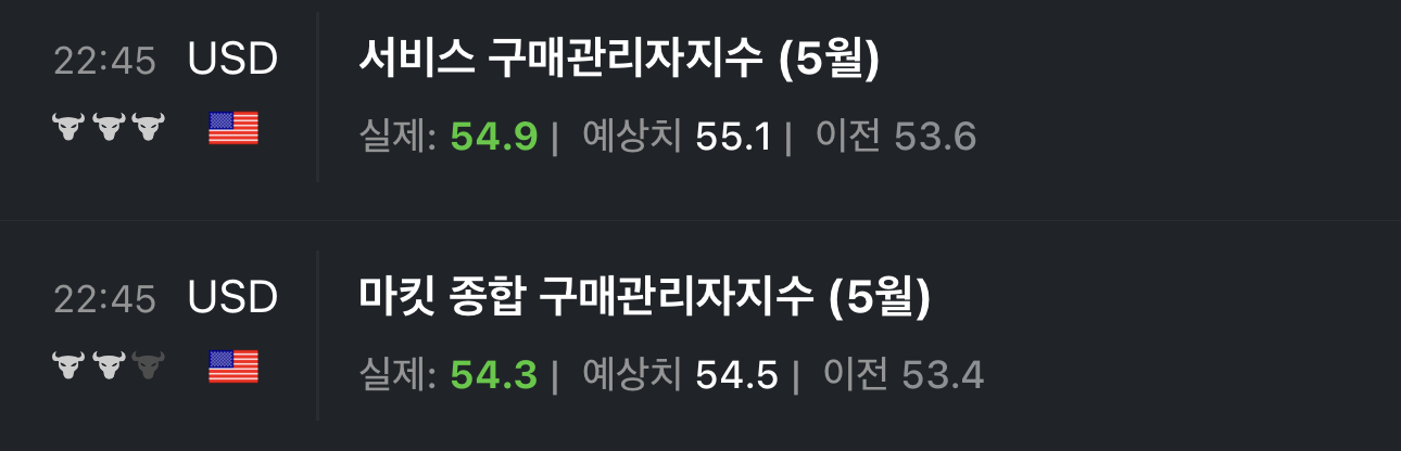 - 서비스업 PMI는 예상치보단 조금 낮게 나오긴 했지만 그래도 지난달보단 상승했다는 점에 유의해야 할 것 같다. 서비스 경기는 죽을 기미가 안 보이는 것 같다.