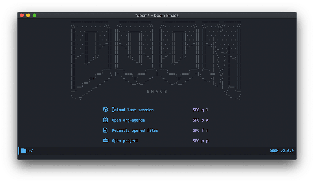 Emacs를 띄워봅시다. 2초도 안 되는 시간에 Emacs가 떴습니다. Doom이라는 화려한 ASCII 아트와 함께 말이지요. 네 설치가 된 것입니다. 이제 정말 끝난 것일까요?