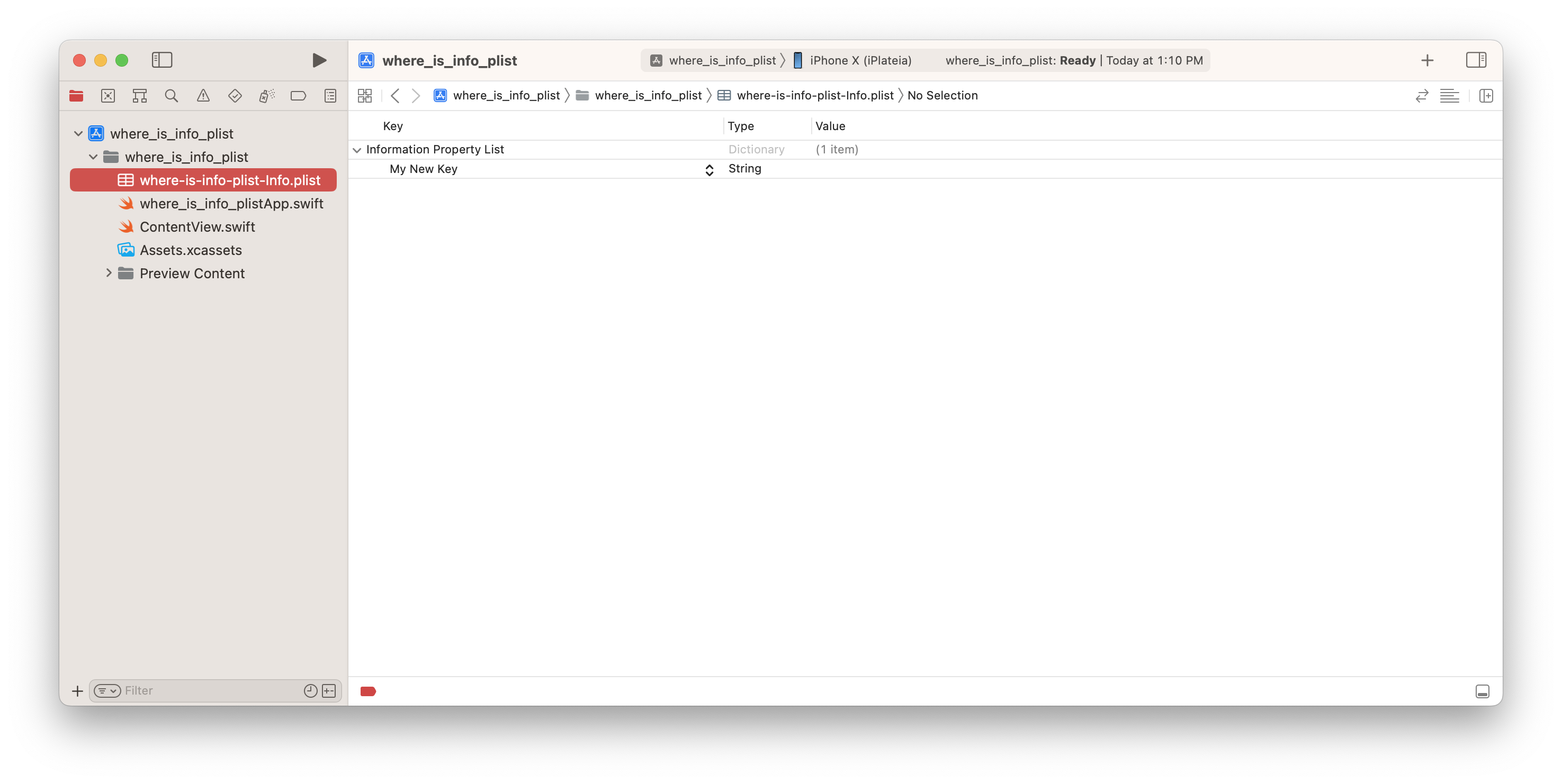 위의 경우 그냥 마음대로 "My New Key"라는 키를 하나 추가했는데 추가된 부분만 이렇게 별도의 '앱이름-Info.plist' 파일로 분리되었다. 이렇게 사용자 설정은 별도의 plist 파일로 분리되는 경우도 있다는 점만 주의하면 그다지 이상한 변화는 아닐 것 같다.