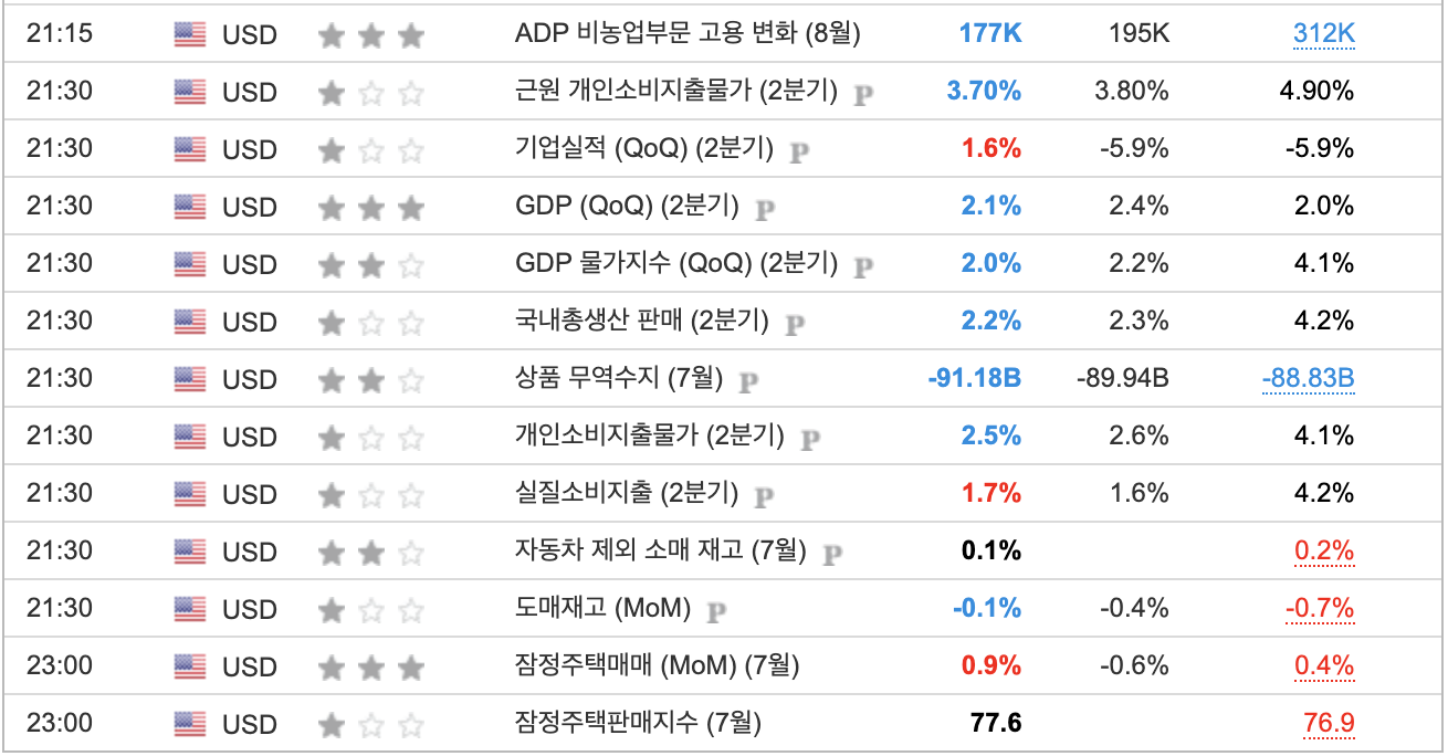고용시장: 어제의 공공 고용 통계에 이어 민간 고용 통계도 예상치를 제법 하회하는 제법 큰 고용시장 둔화가 나타났다. 심지어 이미 발표된 6월 통계도 하향되었다는 소식도 들린다. 오랜 고금리의 치명타가 드디어 보이기 시작한 것일까?