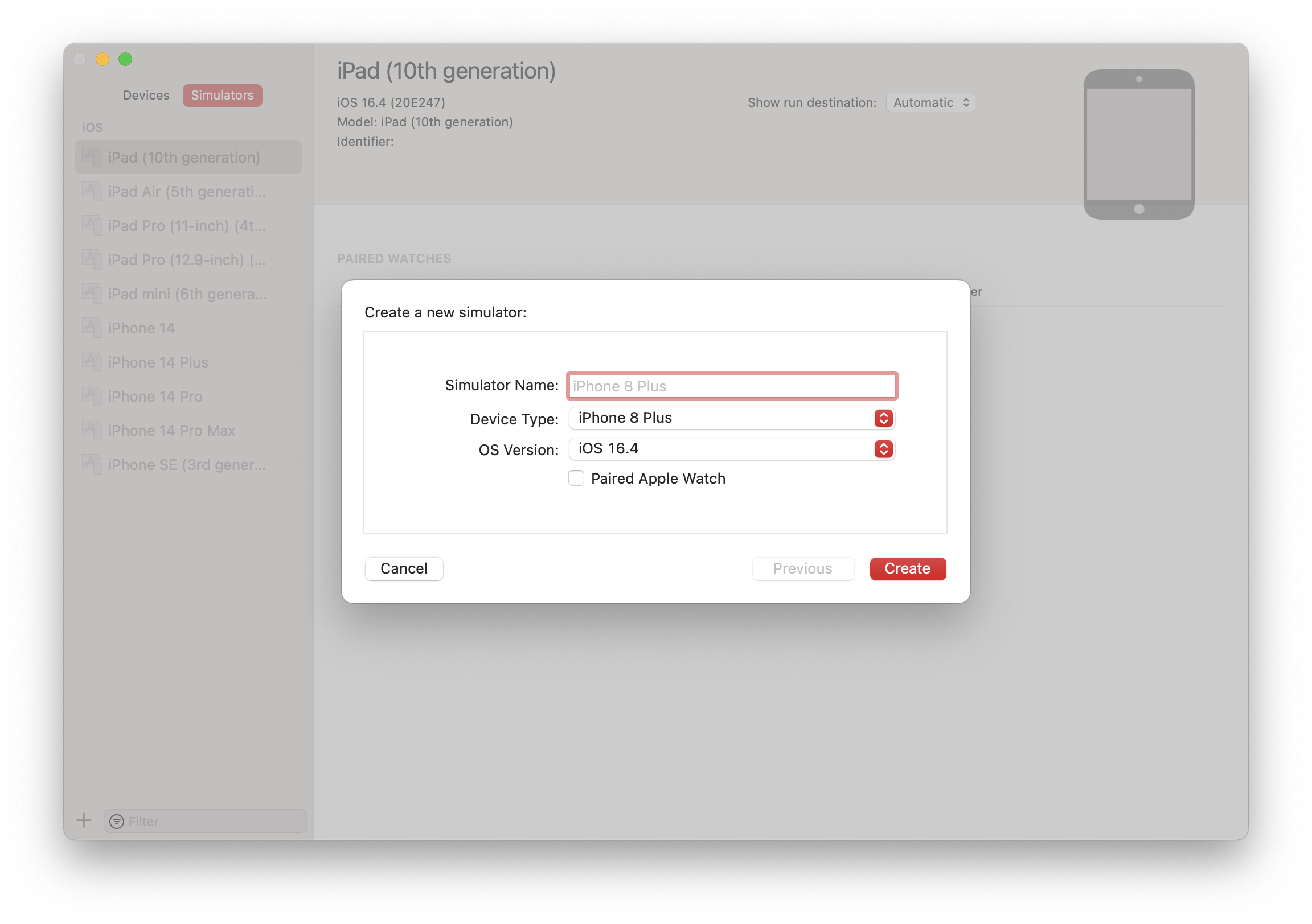 여기서 Device Type을 iPhone 8 Plus로 선택해서 추가해 주면 된다. 아니면 적당히 원하는 시뮬레이터 디바이스를 골라서 추가하면 된다.