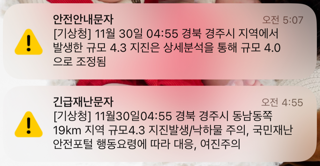 알고 보니 경주에 지진이 났다는 소식이었다. 재난문자로 적절한 중요 재난이다. 당연하게 알림으로 울리는 게 합당하다. 4.0이면 약한 지진이 절대로 아니다.