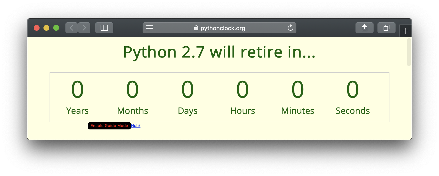 사실 이 링크는 별 의미가 없을지도 모릅니다. 왜냐하면 이미 소임을 다하고 가사상태(?)에 돌입했기 때문이지요. Python 2.7의 남은 퇴출 시간을 표시하던 이 사이트의 카운터가 2020년이 되면서 드디어 0이 되었습니다. 자 이제 낡은 시스템을 버리고 미래로 갈 시간입니다. 그리고 파이썬 3는 2처럼 끈질긴 레거시 문제가 생기지 않았으면 참 좋을 것 같습니다. 😭