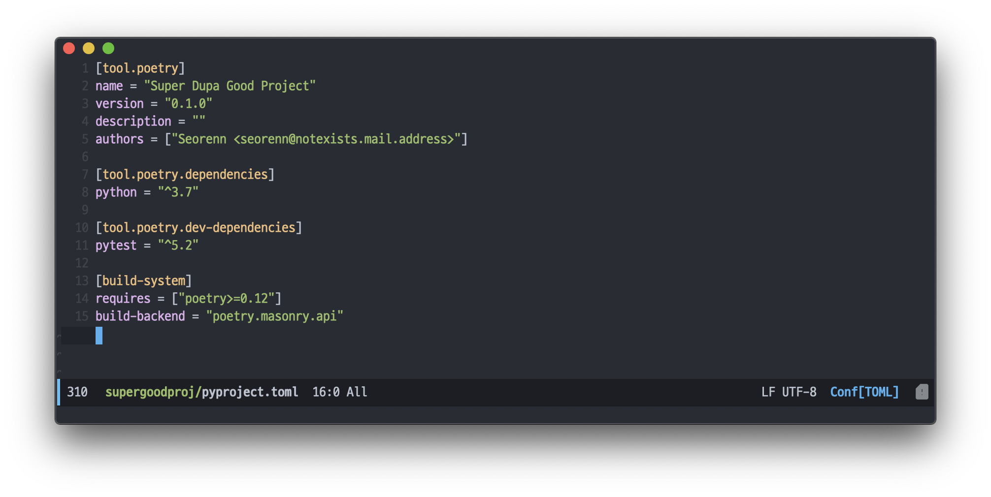 이렇게 하면 현재 디렉터리에 PROJECT_NAME에 해당하는 디렉터리가 생성되며 안에 몇 가지 보일러 플레이트 코드가 생성됩니다. 이 중 가장 중요한 것은 pyproject.toml 이라는 파일입니다. 이 파일에는 각종 패키지 의존 설정이 기록되어 있습니다.