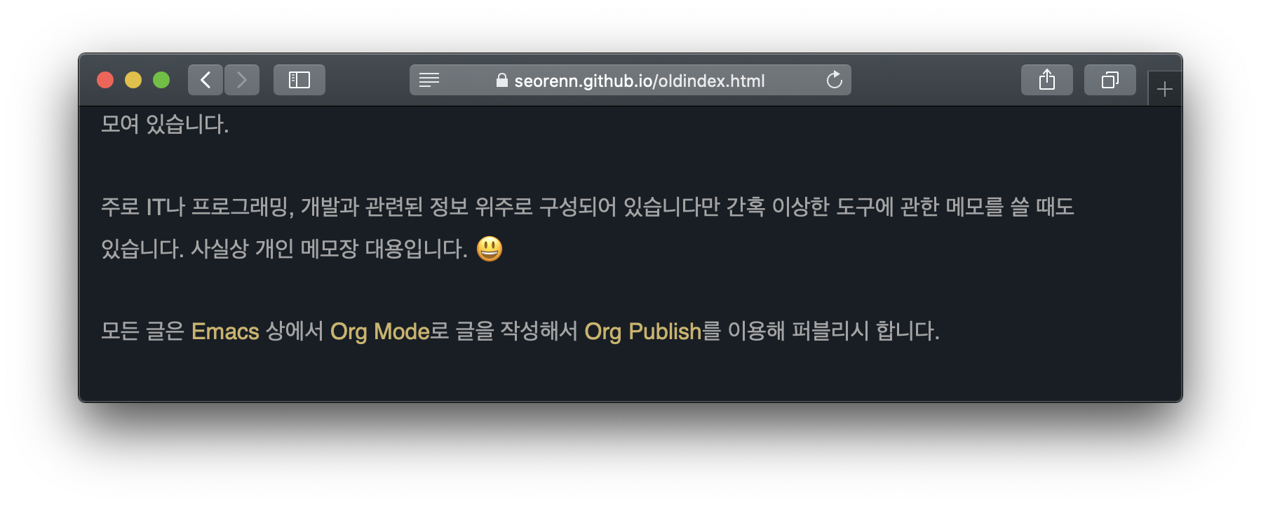 Org Publish는 이맥스(Emacs)에서 Org Mode로 작성된 .org 문서들로 정적 웹사이트를 만들 수 있게 해주는 도구입니다. 쉽게 말해서 특정 디렉터리 안의 .org 파일들을 .html 파일로 익스포트 해서 원하는 디렉터리로 복사해 줍니다. 그리고 각종 css나 스크립트, 이미지 등의 파일도 자동으로 복사하는 등의 기능을 제공합니다. 제 관리가 안 되는 😭 깃헙 페이지도 이 Org Publish를 이용해 만들었습니다.