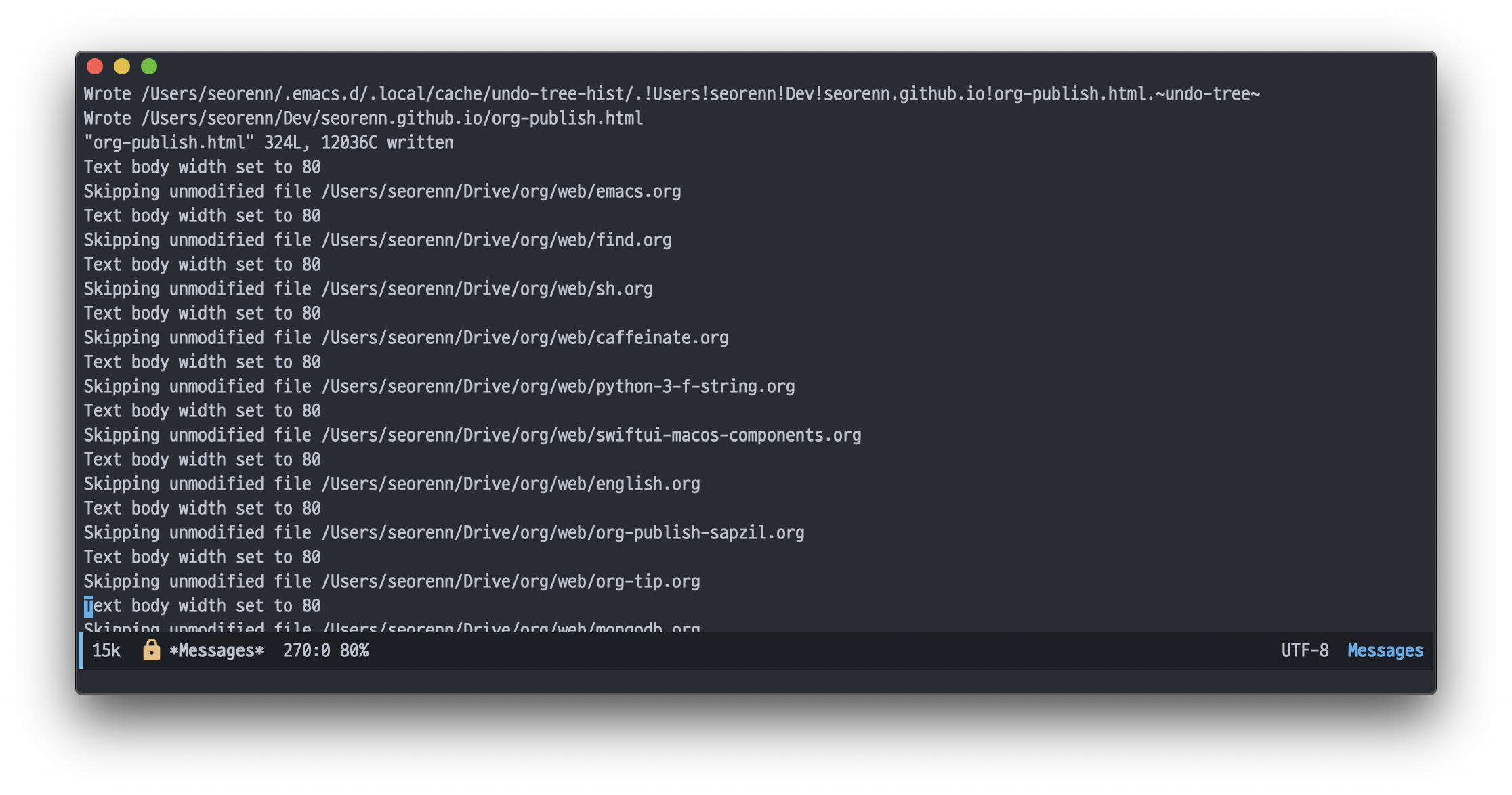 단순하게 Messages 버퍼를 표시하고, 이 버퍼의 하단으로 커서를 옮기고, 약 1초 후 비동기로 org-publish-all 함수를 호출하도록 한 코드입니다. 왜 1초 비동기로 했냐 하면, 이렇게 하지 않으면 Messages 버퍼가 보이기도 전에 Publish가 끝나버려서 왠지 불안했기 때문입니다.