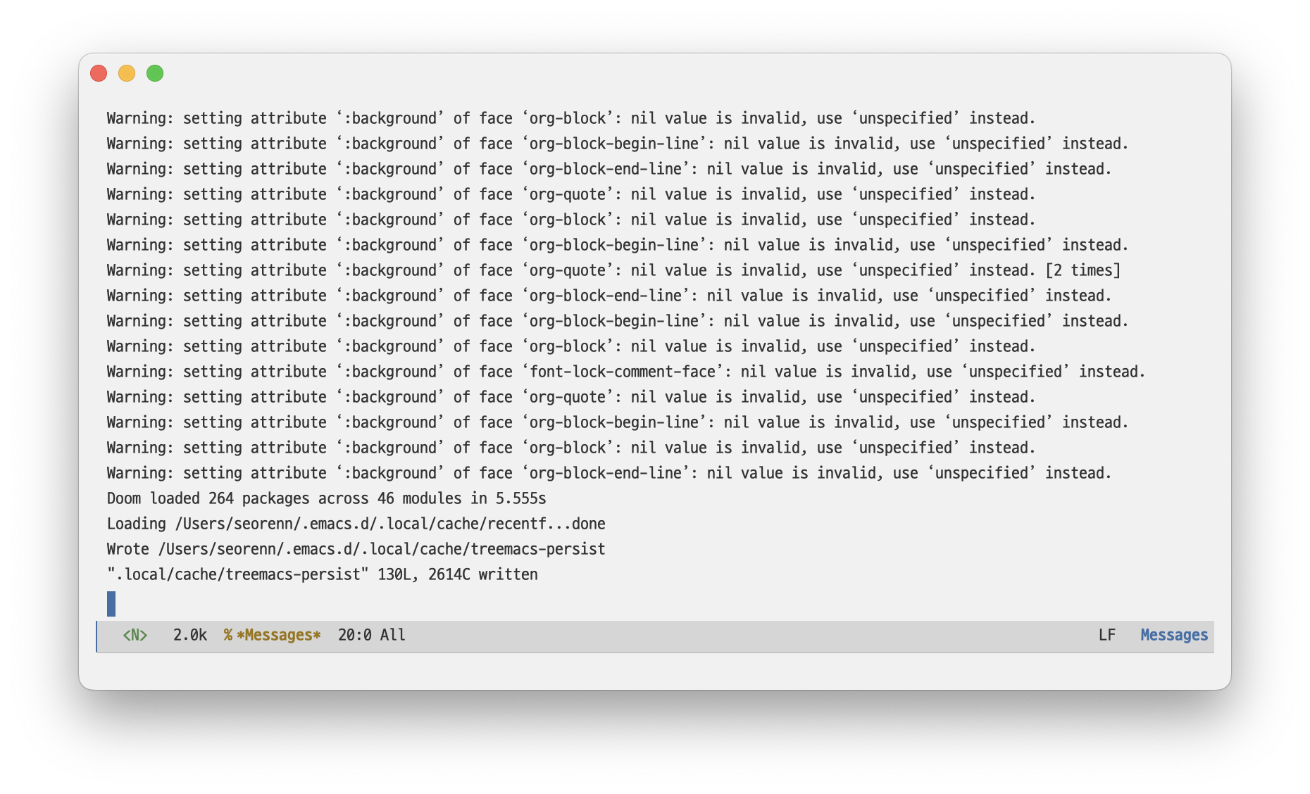 물론 실행 후 바로 에러가 뜨면서 문제를 일으켰다. 기존 Emacs 28.x로 Doom Emacs가 빌드되어 사용되고 있었으니 어쩌면 익숙했다.