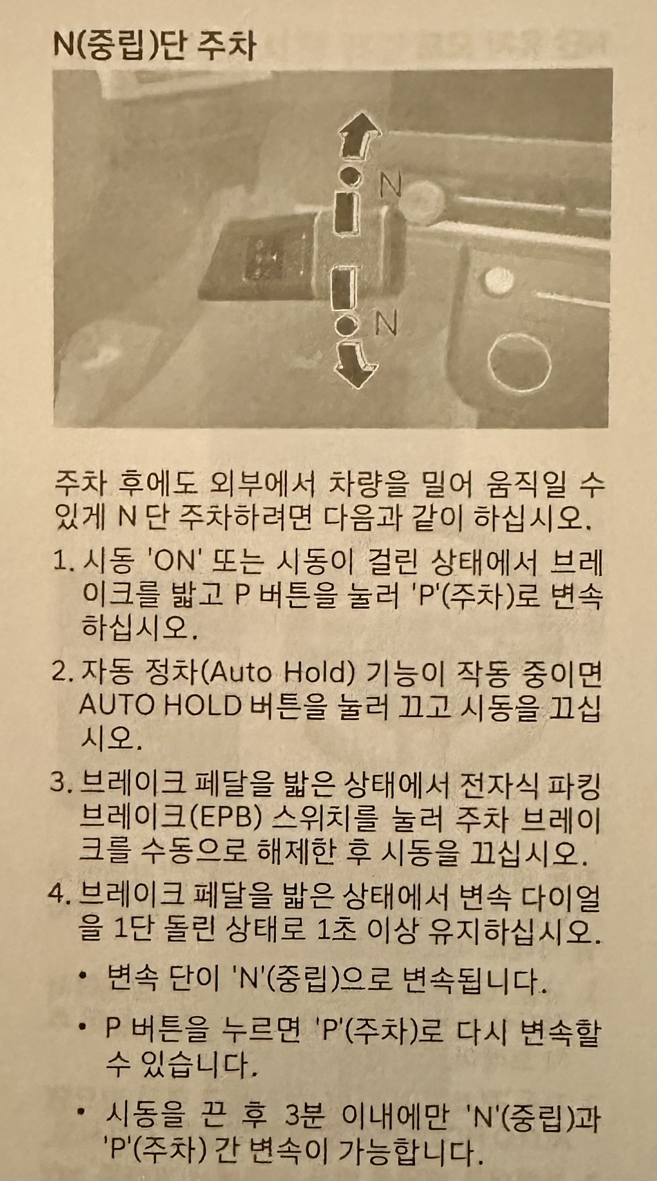 그러다 보니 오히려 약간 애매모호했던 게 있는데 중립 주차를 해야 할 상황이라면 어떻게 해야 하나였다. 주차 공간이 없어서 다른 차들 앞에 평행주차를 해야 할 경우 차를 밀 수 있게 기어는 N단에 놓고 주차 브레이크를 해제해서 주차하는 게 예의다. 하지만 시동을 끌 때는 P단에 놓아야 하는데 N단에는 어떻게 놓을까? EPB는 어떻게 하면 될까?