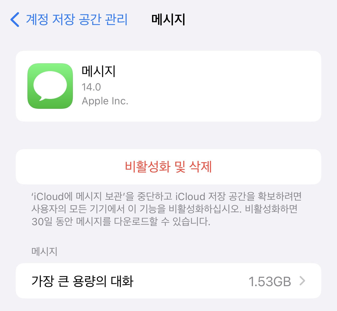 계정 저장 공간 관리 화면에서는 각 앱 별로 차지하는 공간을 확인할 수 있다. 각각의 항목을 눌러보면 비활성화나 데이터 삭제와 관련된 메뉴를 찾을 수 있다.
