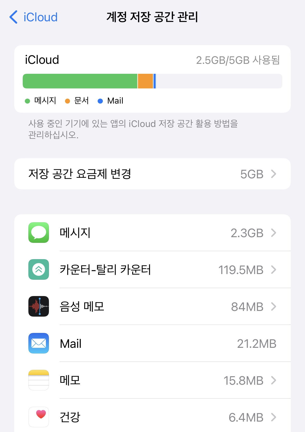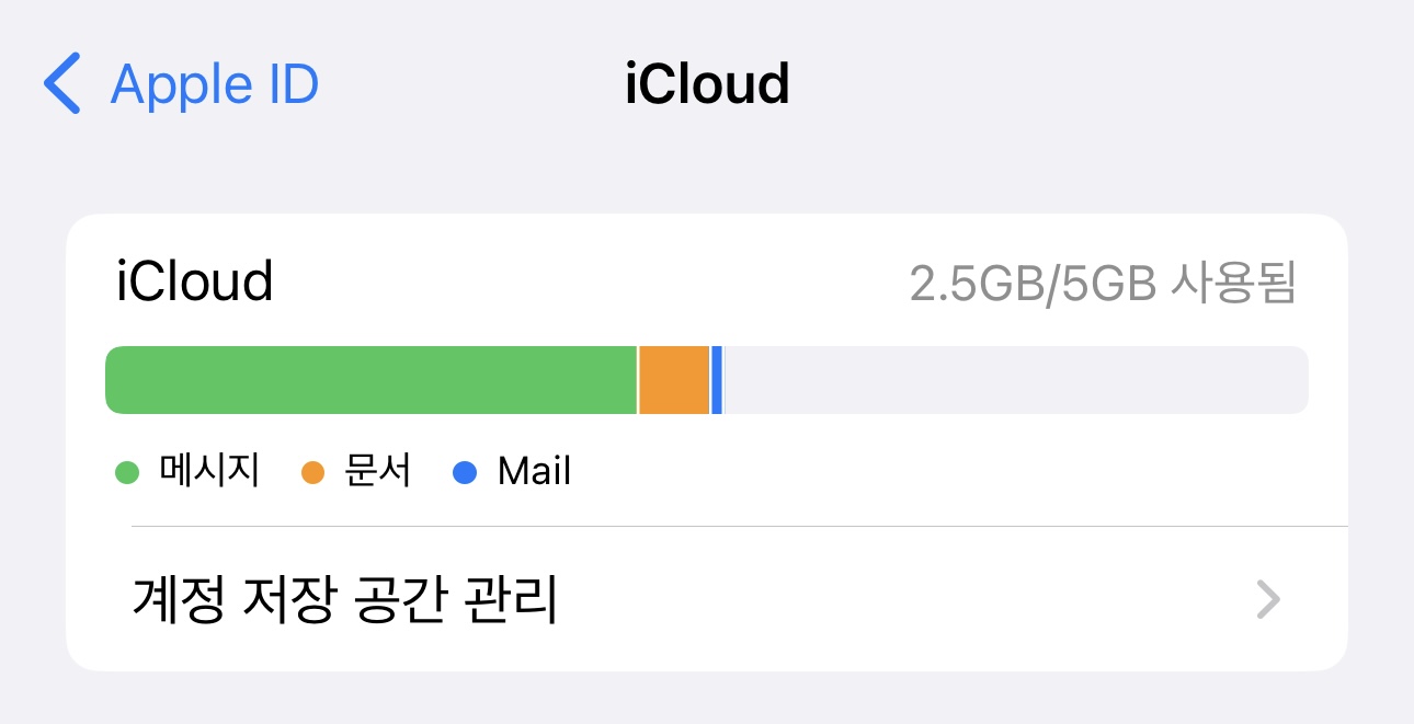 위와 같이 iCloud의 대략적인 공간 점유 비중을 확인할 수 있고 그 아래에 '계정 저장 공간 관리'라는 버튼도 보인다. 뭔가 바로 감이 온다. 이 '계정 저장 공간 관리' 버튼을 눌러보자.