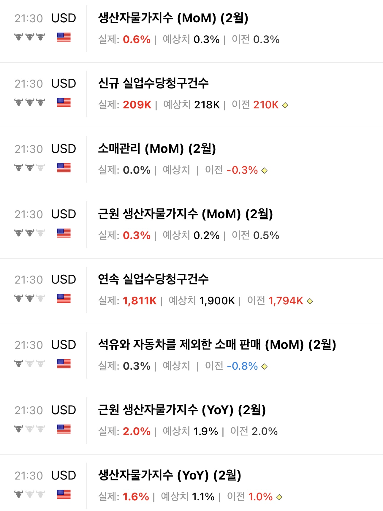 CPI 때와 비슷하게 이번 미국 2월 PPI도 모두 예상을 넘는 물가 상승률이 더 높아졌음을 보여줬다. 그나마 전년비 근원 PPI는 이전 수치보다 오르지 않았다는 것이 유일한 위로거리인 듯하다. 심지어 실업 수당 청구 건수도 낮아진 것 같은데 지난 실업률 높아진 건 도대체 무엇일까 알 수가 없다.