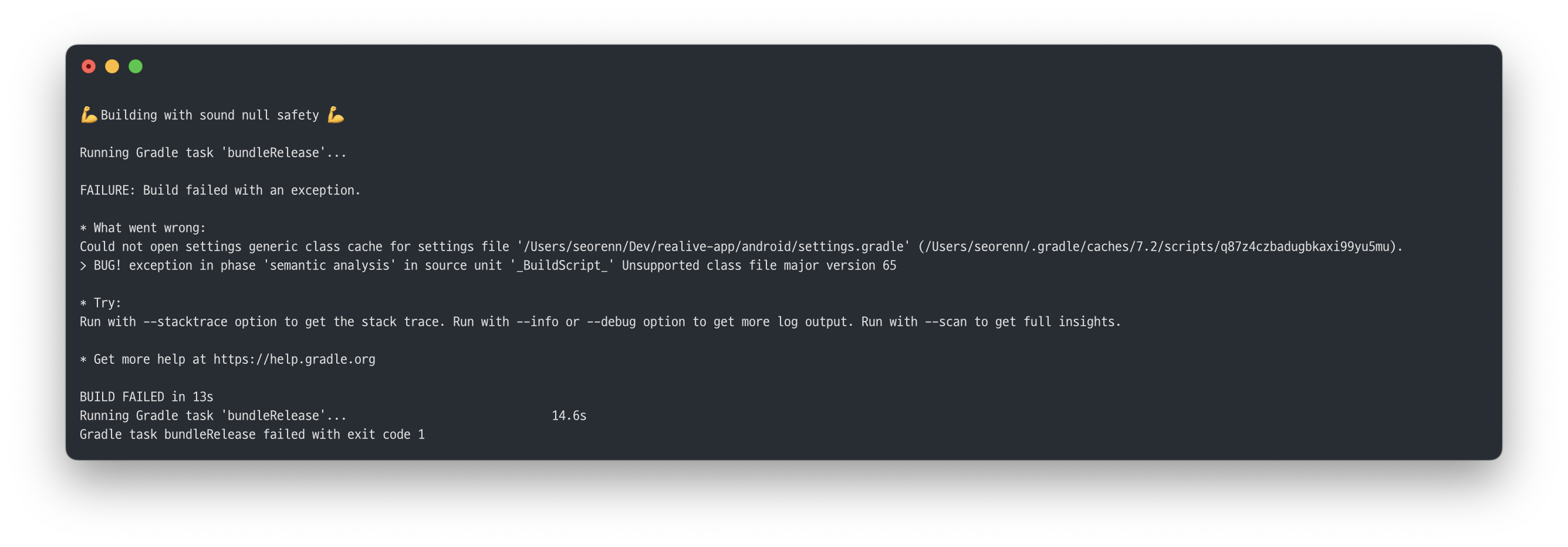 Could not open settings generic class cache for settings file '/Users/seorenn/developments/myproject/android/settings.gradle' (/Users/seorenn/.gradle/caches/7.2/scripts/foobarsomeidentifier).