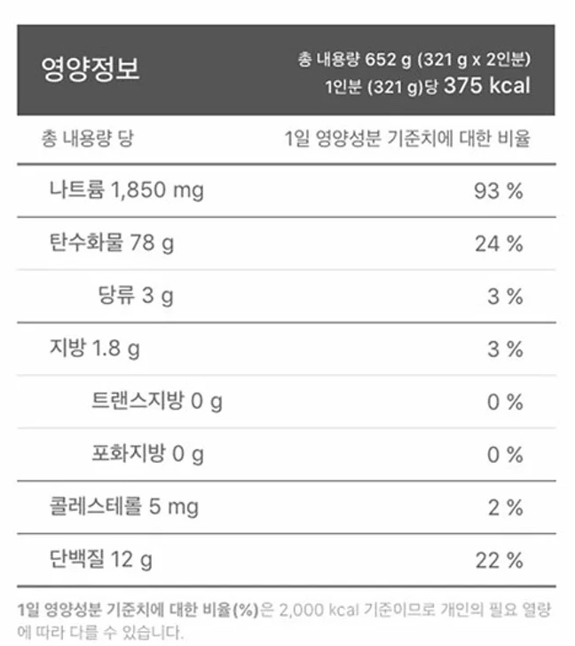 다만 조심해야 할 것이 있는데 나트륨이다. 보다시피 1인분에 나트륨이 거의 하루치가 들어있다. 따라서 국물은 가급적 드링킹 하지 말고 적당히 먹는 것이 좋을 것 같다. 특히 고혈압이 있다면 더더욱 국물은 조금만 먹어야 할 것 같다.