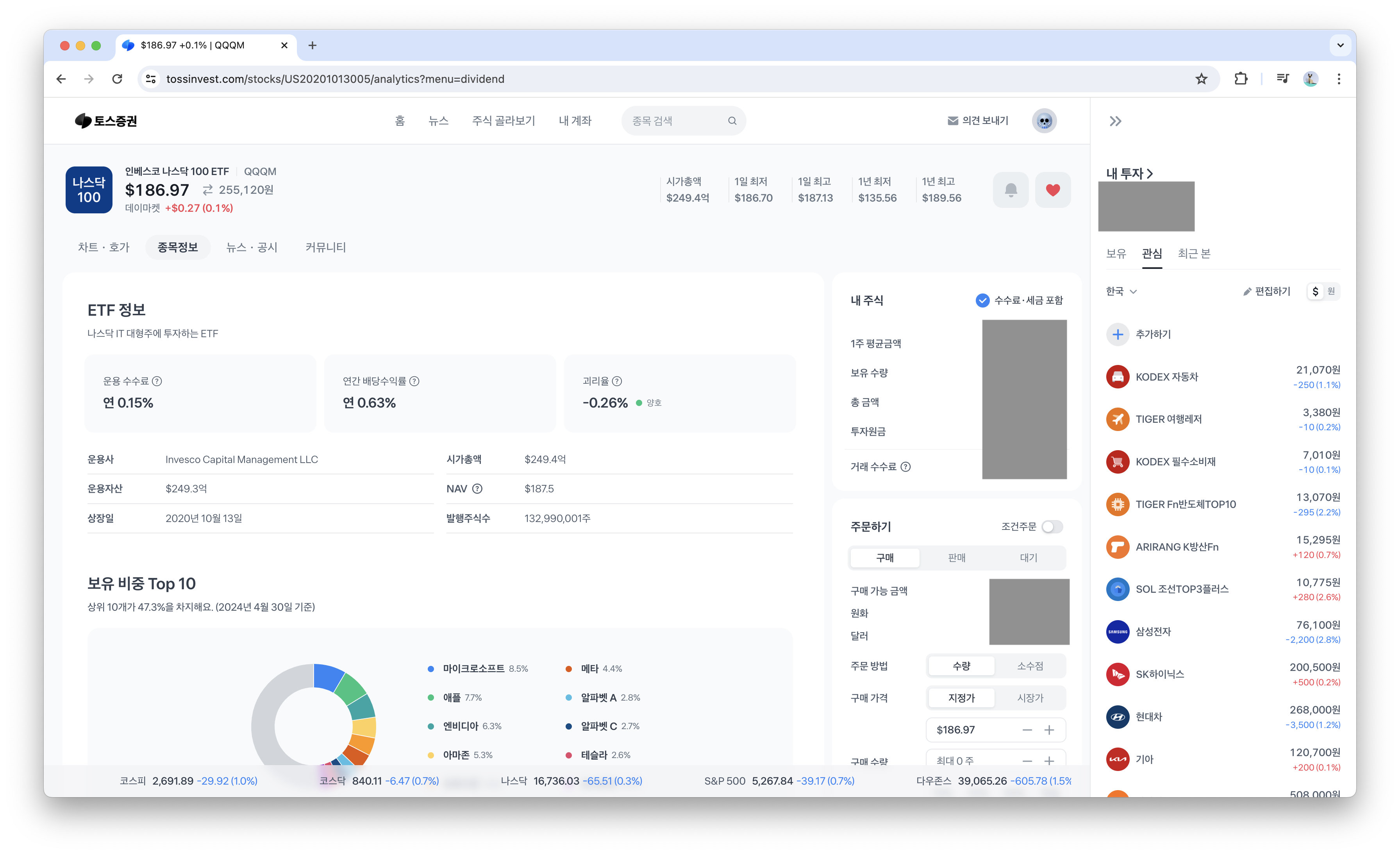 보유 중인 종목을 연 경우에는 우측의 '주문하기' UI 위에 '내 주식'이라는 컴포넌트가 추가로 보인다.