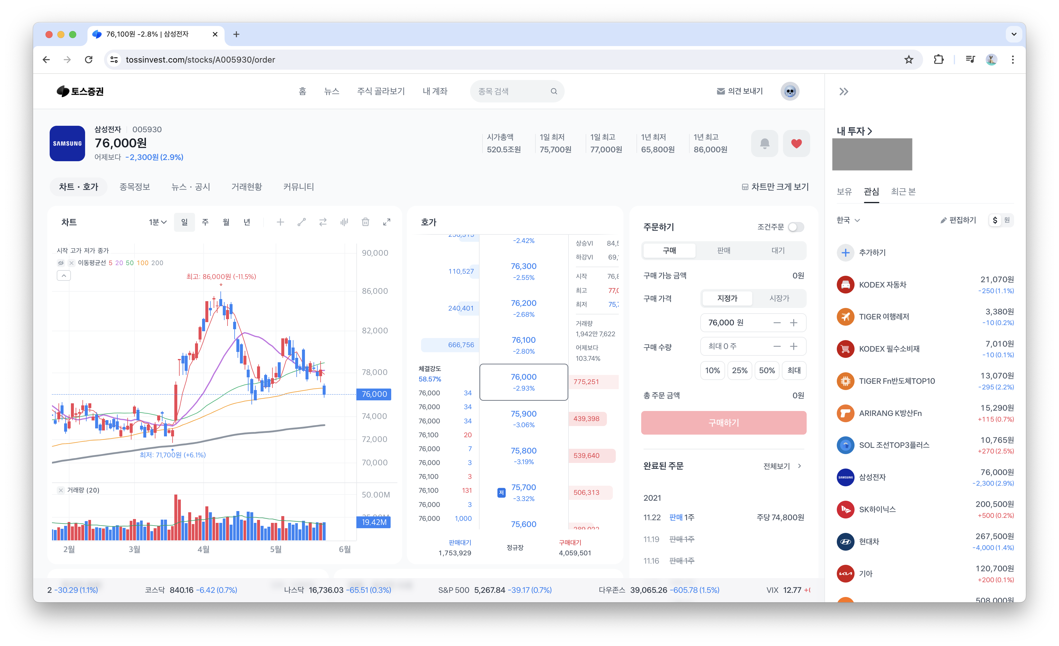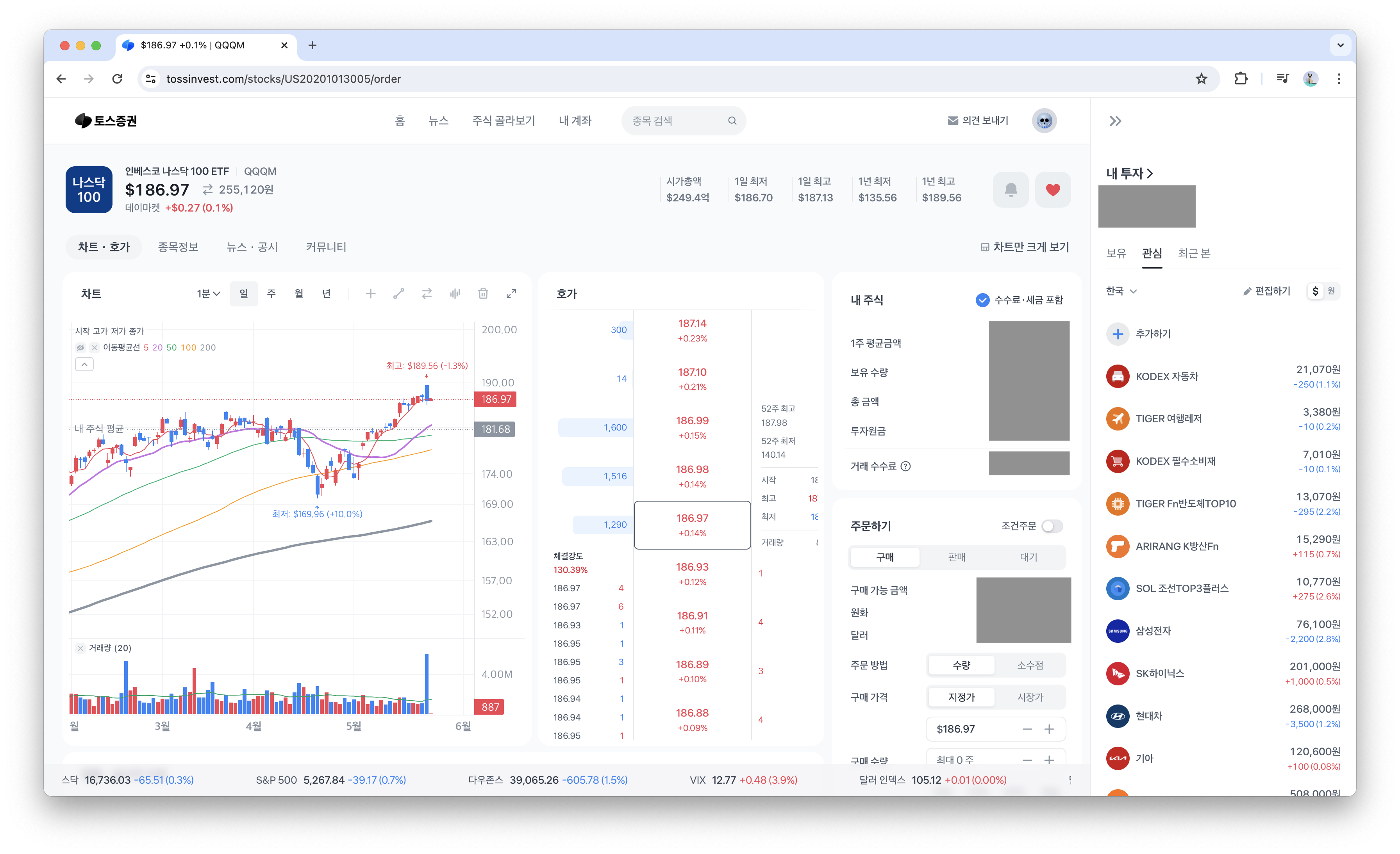 차트와 호가 및 매매 기능이 한 화면에 다 보인다. 이건 분명히 찐이다. 안 그래도 편한 MTS의 기능을 이어받아 더 편할 수밖에 없는 UI다. 다만 사용 중인 맥북의 해상도는 아슬아슬하게 매매 버튼이 보이지 않는 수준이라 조금 아쉽게 느껴지긴 했다.