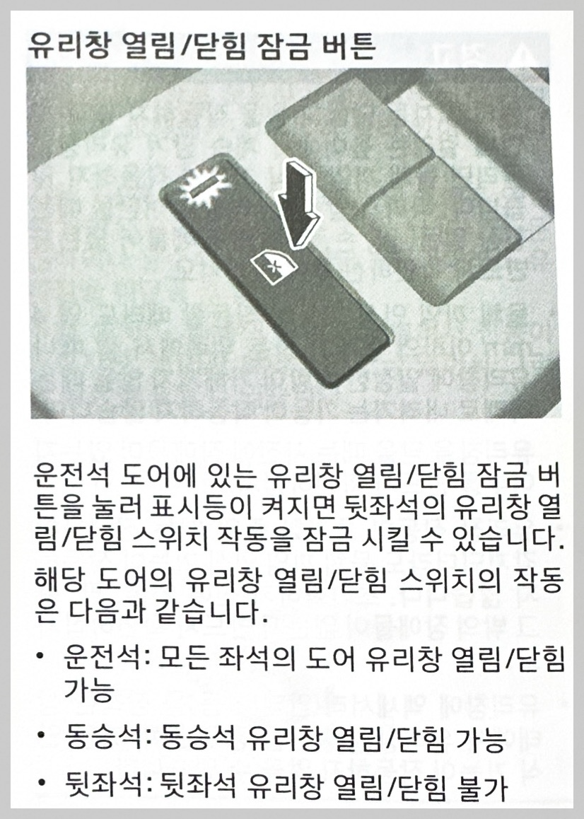 이 '유리창 열림/닫힘 잠금 버튼'이 활성화되어 불이 들어오면 뒷좌석 도어에 달린 유리창 열기/닫기 버튼이 봉인된다. 즉 운전석에서만 뒷좌석 창문을 열고 닫아줄 수 있게 된다. 따라서 아이들이 유리창으로 장난치는 것을 막을 수 있다.