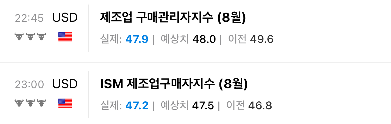 제조업 PMI, 즉 제조업 구매관리자들의 설문조사를 통해 해당 업계의 경기가 어떤지를 간접적으로 파악하는 지표가 50 이하로 위축세로 정리되었다. 이전에 엔캐리트레이드 청산과 함께 맞물렸던 이벤트가 ISM 제조업 PMI가 낮게 나온 일이 있었으니 이번에도 그런 걸까?