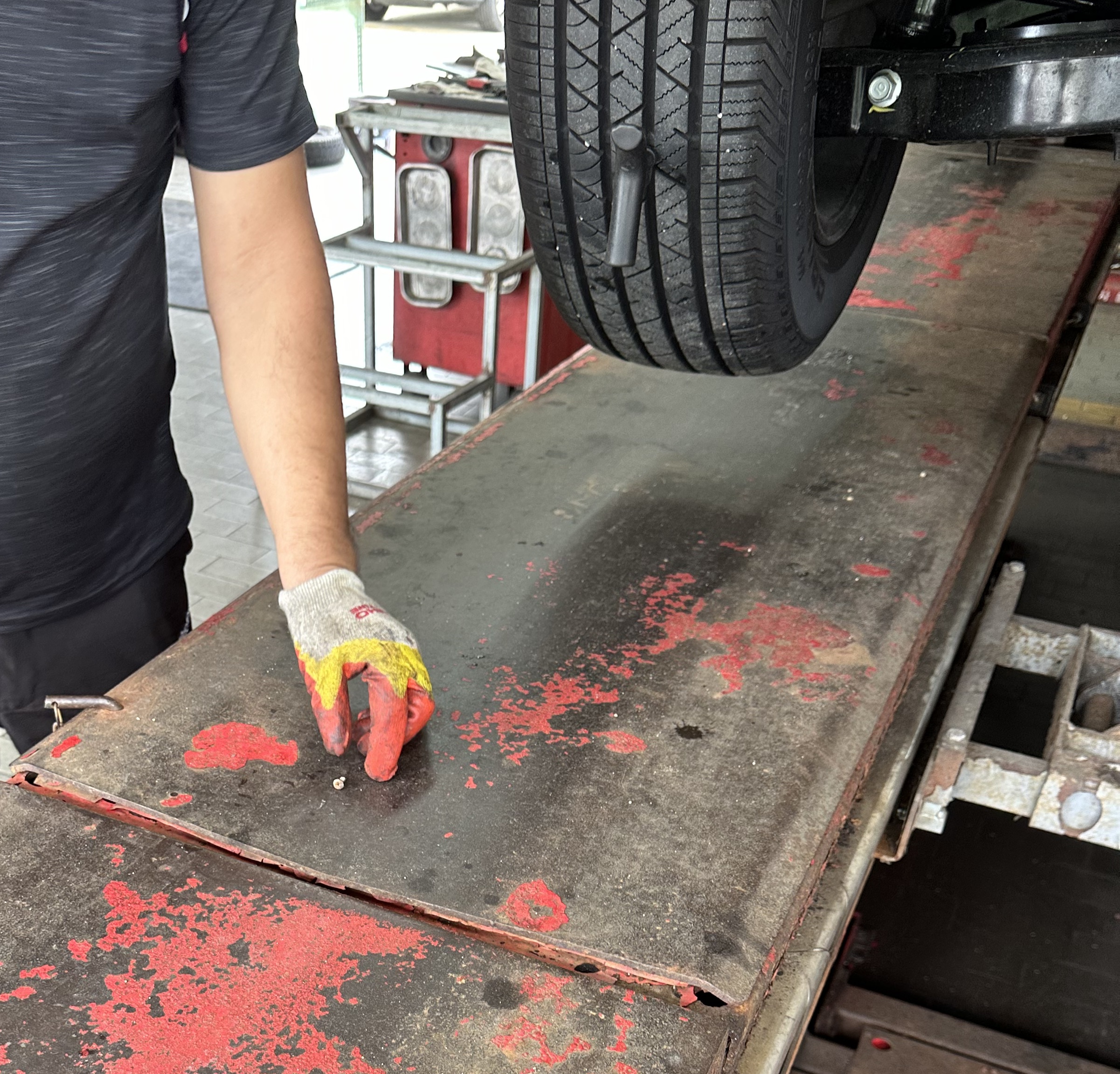먼저 온 손님들의 상대가 끝난 후 드디어 내 차례가 되었다. 사장님은 능숙한 손놀림으로 차를 정비대로 올려놓고 기구를 조작한다. 그리고 타이어를 이리저리 돌려보다 갑자기 날 부르신다.