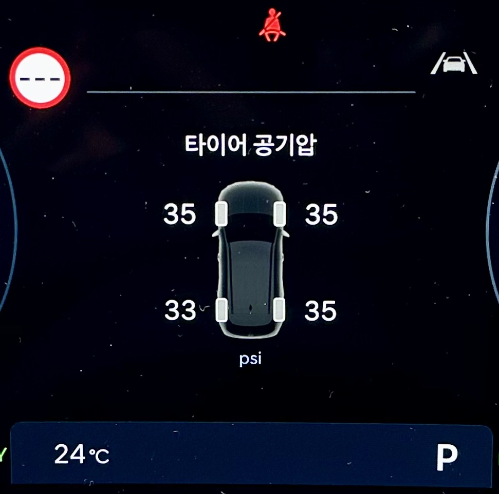 이전에 투싼의 타이어 공기압 부족 경고로 휴대용 컴프레서로 채웠던 이후로 문제가 해결되나 싶었는데 불행히도 해당 타이어의 공기압 부족 경고가 또 떴다. 심지어 그 이후 공기를 한번 더 채웠는데도 차량에서는 공기압이 다른 타이어 보다도 더 적게 감지되고 있었다. 아래 사진은 컴프레서로 해당 타이어에 공기를 37 psi 정도로 채운 지 일주일도 안 지난 상황이다.